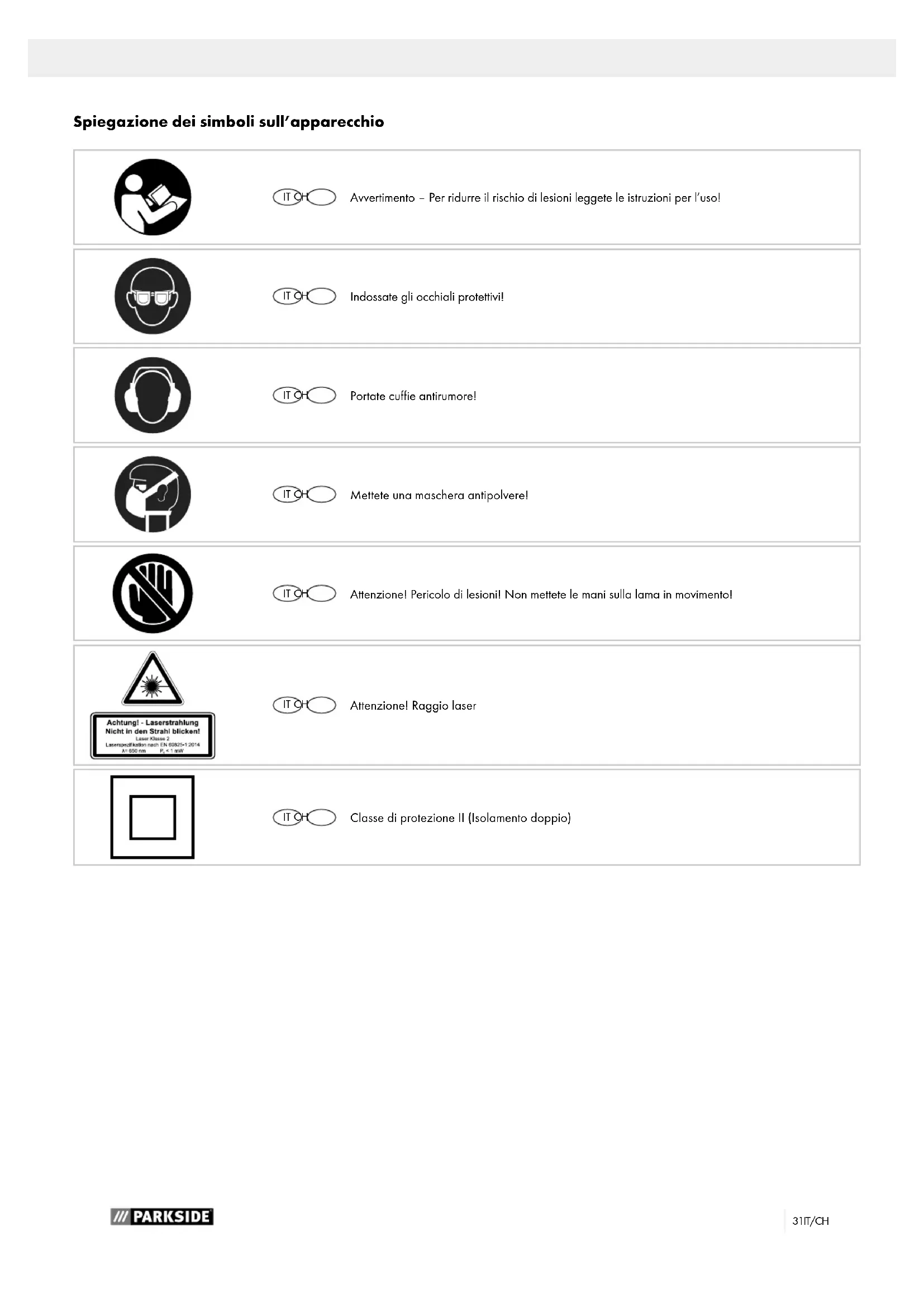 - Prima di collegare la segatrice, accertarsi che i dati sulla tar- ghetta del modello corrispondano ai dati della rete elettrica disponibile.38 IT/CH