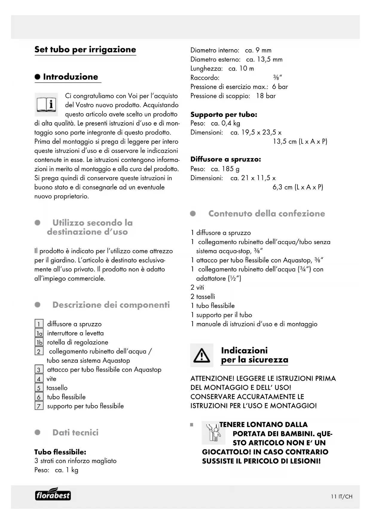 supporto per tubo flessibile Dati tecnici Tubo flessibile: 3 strati con rinforzo magliato Peso: ca. 1 kg Diametro interno: ca. 9 mm Diametro esterno: ca. 13,5 mm Lunghezza: ca. 10 m Raccordo: ⅜“ Pressione di esercizio max.: 6 bar Pressione di scoppio: 18 bar Supporto per tubo: Peso: ca. 0,4 kg Dimensioni: ca. 19,5 x 23,5 x 13,5 cm (L x A x P) Diffusore a spruzzo: Peso: ca. 185 g Dimensioni: ca. 21 x 11,5 x 6,3 cm (L x A x P) Contenuto della confezione 1 diffusore a spruzzo 1 collegamento rubinetto dell‘acqua/tubo senza sistema acqua-stop, ⅜“ 1 attacco per tubo flessibile con Aquastop, ⅜“ 1 collegamento rubinetto dell‘acqua (¾“) con adattatore (½“) 2 viti 2 tasselli 1 tubo flessibile 1 supporto per il tubo 1 manuale di istruzioni d‘uso e di montaggio Indicazioni per la sicurezza