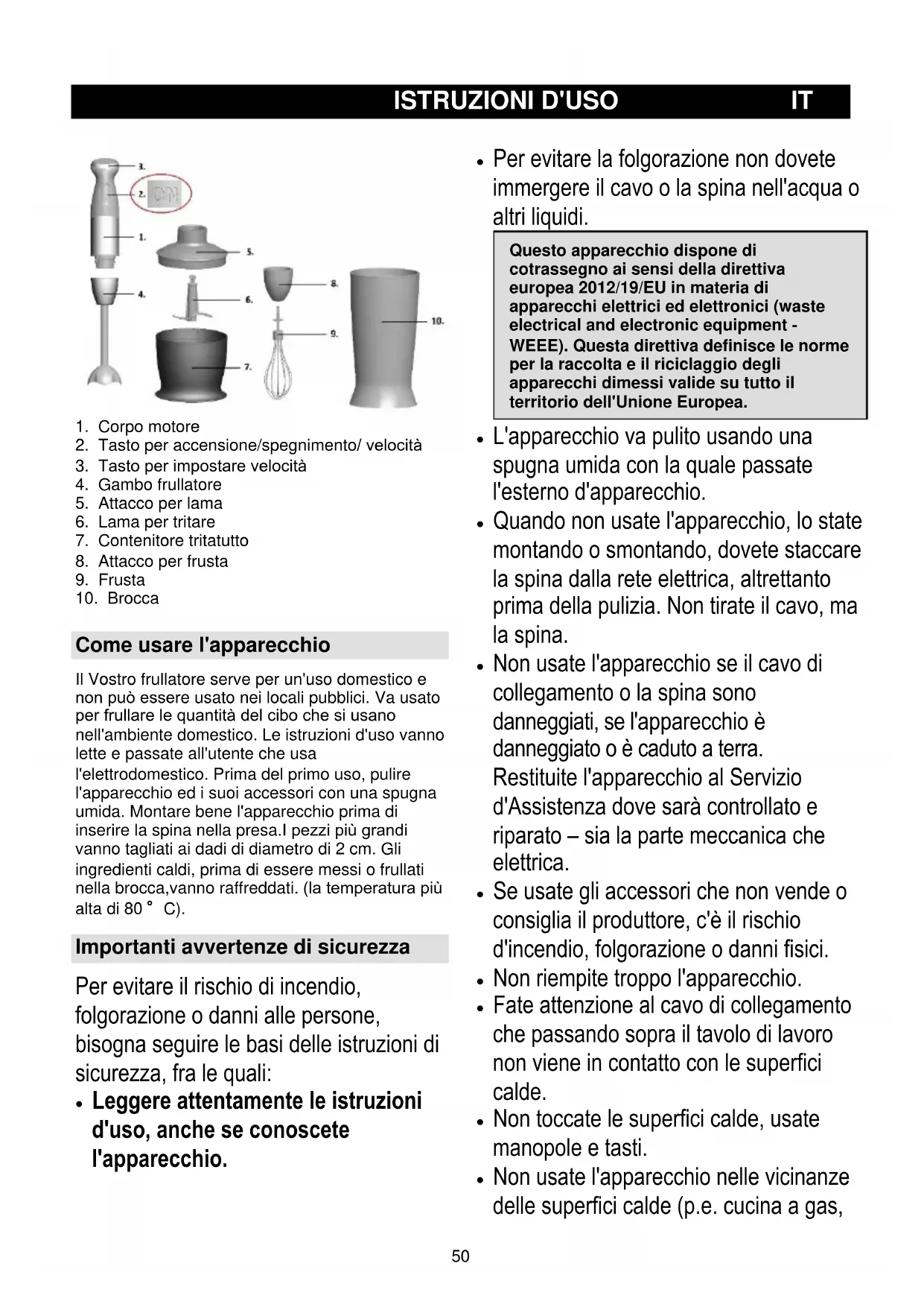 - Non usate l'apparecchio nelle vicinanze delle superfici calde (p.e. cucina a gas, Questo apparecchio dispone di cotrassegno ai sensi della direttiva europea 2012/19/EU in materia di apparecchi elettrici ed elettronici (waste electrical and electronic equipment - WEEE). Questa direttiva definisce le norme per la raccolta e il riciclaggio degli apparecchi dimessi valide su tutto il territorio dell'Unione Europea.51 forno), altrettanto non posizionate l'apparecchio vicino ai fonti di calore.