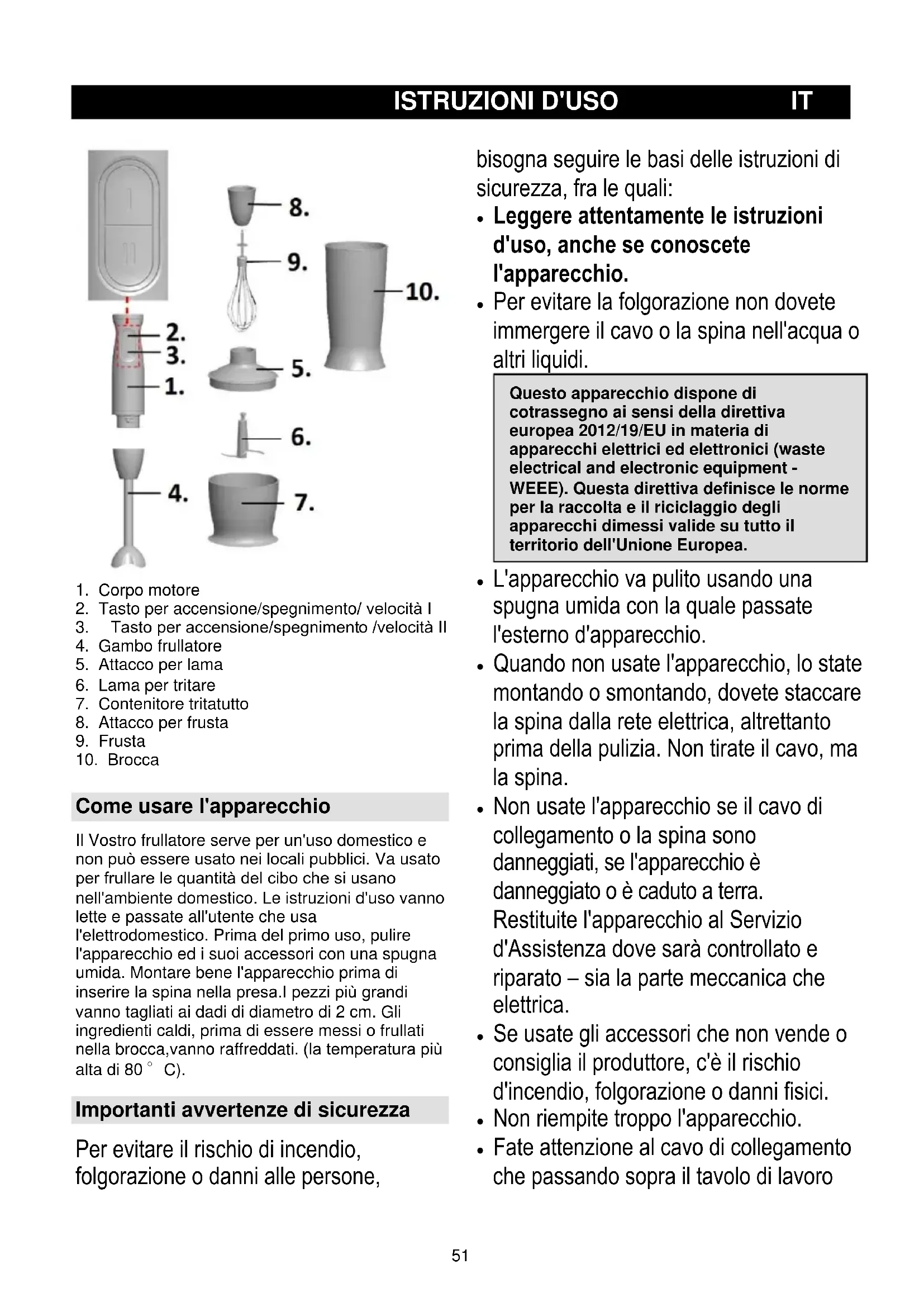 Come usare l'apparecchio Il Vostro frullatore serve per un'uso domestico e non può essere usato nei locali pubblici. Va usato per frullare le quantità del cibo che si usano nell'ambiente domestico. Le istruzioni d'uso vanno lette e passate all'utente che usa l'elettrodomestico. Prima del primo uso, pulire l'apparecchio ed i suoi accessori con una spugna umida. Montare bene l'apparecchio prima di inserire la spina nella presa.I pezzi più grandi vanno tagliati ai dadi di diametro di 2 cm. Gli ingredienti caldi, prima di essere messi o frullati nella brocca,vanno raffreddati. (la temperatura più alta di 80 °C). Importanti avvertenze di sicurezza Per evitare il rischio di incendio, folgorazione o danni alle persone, bisogna seguire le basi delle istruzioni di sicurezza, fra le quali: