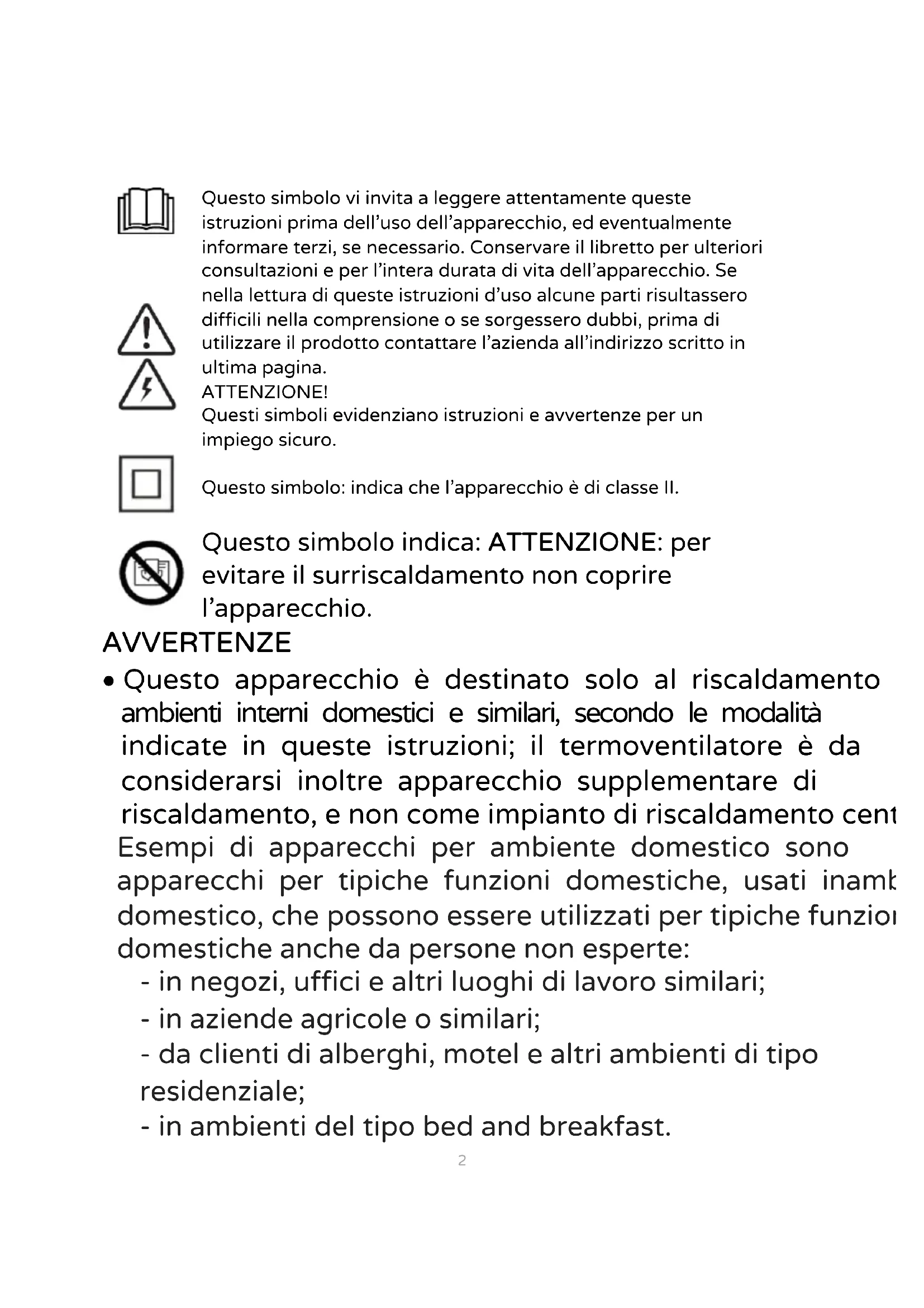 AVVERTENZE Questo apparecchio è destinato solo al riscaldamento di ambienti interni domestici e similari, secondo le modalità indicate in queste istruzioni; il termoventilatore è da considerarsi inoltre apparecchio supplementare di riscaldamento, e non come impianto di riscaldamento centrale. Esempi di apparecchi per ambiente domestico sono apparecchi per tipiche funzioni domestiche, usati inambito domestico, che possono essere utilizzati per tipiche funzioni domestiche anche da persone non esperte: - in negozi, uffici e altri luoghi di lavoro similari; - in aziende agricole o similari; - da clienti di alberghi, motel e altri ambienti di tipo residenziale; - in ambienti del tipo bed and breakfast.