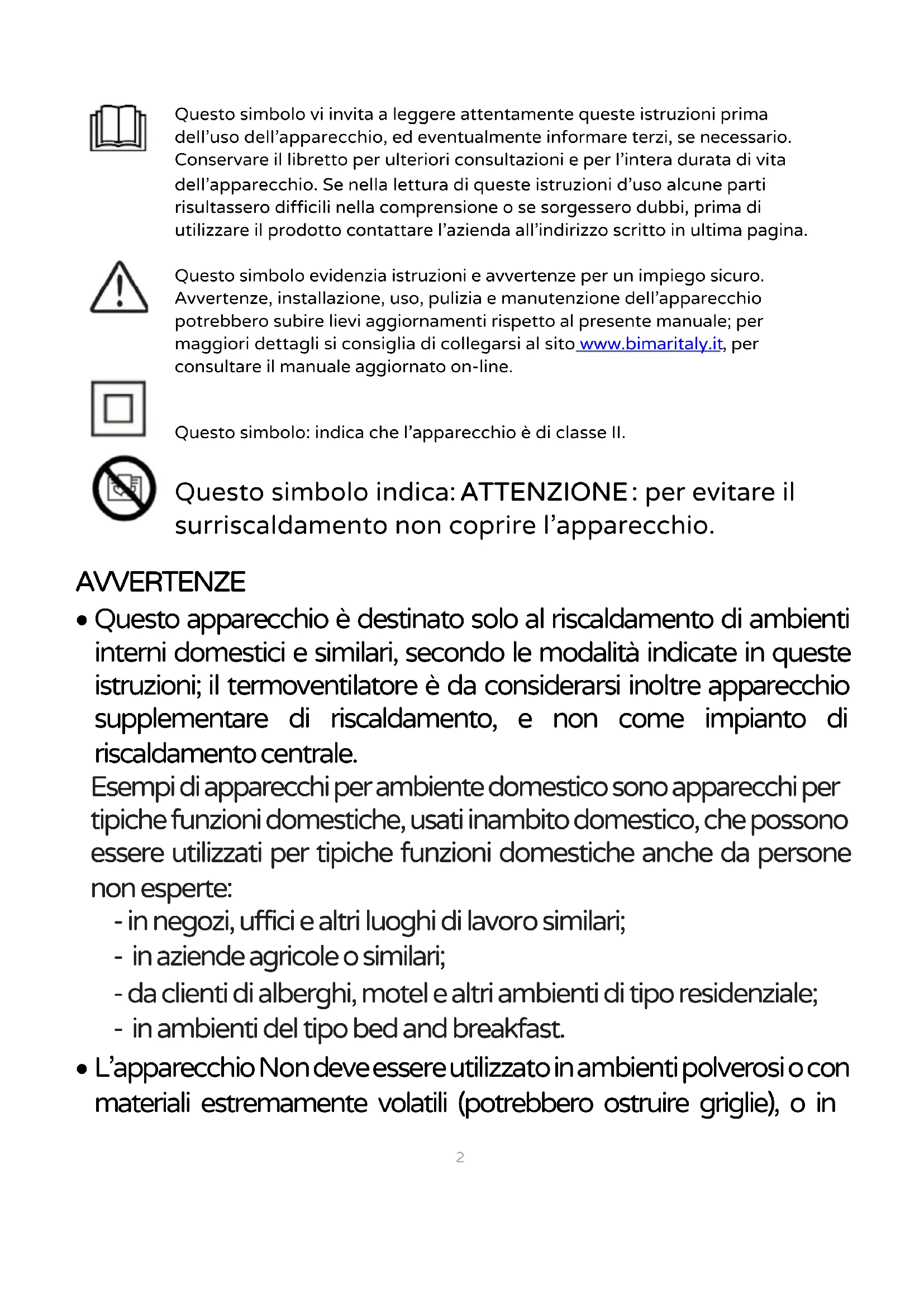 Questo simbolo vi invita a leggere attentamente queste istruzioni prima dell’uso dell’apparecchio, ed eventualmente informare terzi, se necessario. Conservare il libretto per ulteriori consultazioni e per l’intera durata di vita dell’apparecchio. Se nella lettura di queste istruzioni d’uso alcune parti risultassero difficili nella comprensione o se sorgessero dubbi, prima di utilizzare il prodotto contattare l’azienda all’indirizzo scritto in ultima pagina. Questo simbolo evidenzia istruzioni e avvertenze per un impiego sicuro. Avvertenze, installazione, uso, pulizia e manutenzione dell’apparecchio potrebbero subire lievi aggiornamenti rispetto al presente manuale; per maggiori dettagli si consiglia di collegarsi al sito www.bimaritaly.it, per consultare il manuale aggiornato on-line.
