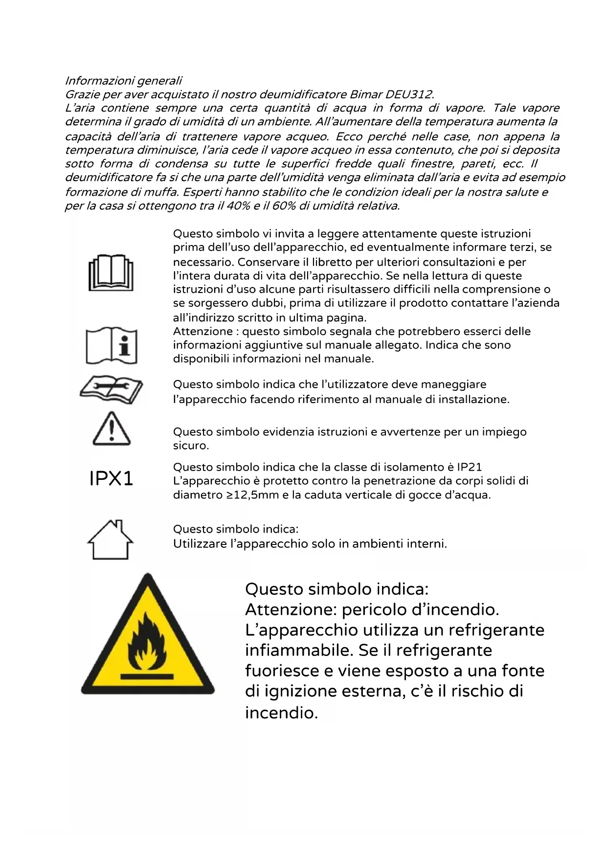 Questo simbolo indica: Attenzione: pericolo d’incendio. L’apparecchio utilizza un refrigerante infiammabile. Se il refrigerante fuoriesce e viene esposto a una fonte di ignizione esterna, c'è il rischio di incendio.AVVERTENZE GENERALI Questo apparecchio è destinato solo all’uso domestico (quindi non professionale), per deumidificare cioè ridurre la percentuale di umidità relativa dell’aria in ambienti interni, secondo le modalità riportate nel presente manuale. Non utilizzare l’apparecchio in ambienti particolarmente polverosi, o con materiali estremamente volatili che potrebbero ostruire il filtro o danneggiare il motore o all’aperto. Esempi di apparecchi per ambiente domestico sono apparecchi per tipiche funzioni domestiche, usati in ambito domestico, che possono essere utilizzati per tipiche funzioni domestiche anche da persone non esperte: - in negozi, uffici e altri luoghi di lavoro similari; - in aziende agricole o similari; - da clienti di alberghi, motel e altri ambienti di tipo residenziale; - in ambienti del tipo bed and breakfast. L’apparecchio è creato per funzionare ad una temperatura compresa tra 5°C e 32°C. Utilizzare il deumidificatore solo se tutti i suoi elementi sono inseriti in modo corretto. Usare il deumidificatore sempre e solamente in posizione verticale; non sedersi o salire sull’unità. Attenzione: quando si utilizzano apparecchi elettrici, occorre sempre rispettare le precauzioni di sicurezza di base per evitare i rischi di incendio, di scosse elettriche e di lesioni fisiche. Ancor più attenzione e precauzione necessita nell’uso di apparecchi elettrici che incorporano un serbatoiocon acqua: nel caso di tracimazioni di acqua e se dell’acqua dovesse bagnare il cordone e la spina di corrente, per primo disattivare la presa di corrente spegnendo l’interruttore del quadro elettrico, e solo dopo togliere la spina dalla presa di corrente. Asciugare con cura sia spina e cordone elettrico e solo dopo riattivare la corrente alla presa. In caso di dubbio, rivolgersi a personale professionalmente qualificato. L’apparecchio può essere utilizzato da bambini di età non inferiore a 8 anni e da persone con ridotte capacità fisiche, sensoriali o mentali, o prive di esperienza o della necessaria conoscenza, purché sotto sorveglianza oppure dopo che le stesse abbiano ricevuto istruzioni relative all’uso sicuro dell’apparecchio e alla comprensione dei pericoli ad esso inerenti. I bambini non devono giocare con l’apparecchio. La pulizia e la manutenzione destinata ad essere effettuata dall’utilizzatore non deve essere effettuata da bambini senza sorveglianza. Adottate le dovute precauzioni per evitare che i bambini giochino con l’apparecchio. L’apparecchio con tutti gli accessori devono essere mantenuti fuori dalla portata di bambini. Non ostruire la griglia di aspirazione e di emissione aria. Non introdurre dita o oggetti nei condotti delle griglie di ingresso o uscita dell’aria. Non toccare l’apparecchio o la spina di corrente con mani bagnate e piedi bagnati. Evitare di esporre a lungo parti del proprio corpo all’aria in uscita dell’apparecchio, per evitare danni alla propria salute. Se l’apparecchio non è in funzione togliere la spina dalla presa di corrente. Non spostare l’apparecchio durante il funzionamento. Non tirare il cavo di alimentazione o l’apparecchio stesso per disinserire la spina dalla presa di corrente. Non tirare il cavo per spostare l’apparecchio. Scollegare sempre l’apparecchio dalla presa di corrente prima di assemblare, smontare, svuotare il serbatoio, e prima di pulire il filtro e l’apparecchio. Se il cavo di alimentazione è danneggiato, esso deve sostituito dal costruttore o dal suo servizio assistenza tecnica o comunque da una persona con qualifica similare, in modo da prevenire ogni rischio. Questo apparecchio non è destinato a essere fatto funzionare per mezzo di un temporizzatore esterno o con un sistema di comando a distanza separato, per evitare il rischio di incendio nel caso l’apparecchio sia coperto o sia posizionato in modo non corretto. Non lasciare l’apparecchio esposto agli agenti atmosferici (sole, pioggia ecc.). Al fine di proteggersi da ogni rischio di shock elettrico, non immergere la spina, il cordone elettrico e l’apparecchio nell’acqua od in nessun altro liquido. Non bere o utilizzare acqua raccolta nel serbatoio. Ogni altro uso è da considerarsi improprio e pericoloso. Il costruttore non potrà essere ritenuto responsabile di eventuali danni derivanti da uso improprio, erroneo eirresponsabile e/o da riparazioni effettuate da personale non qualificato.