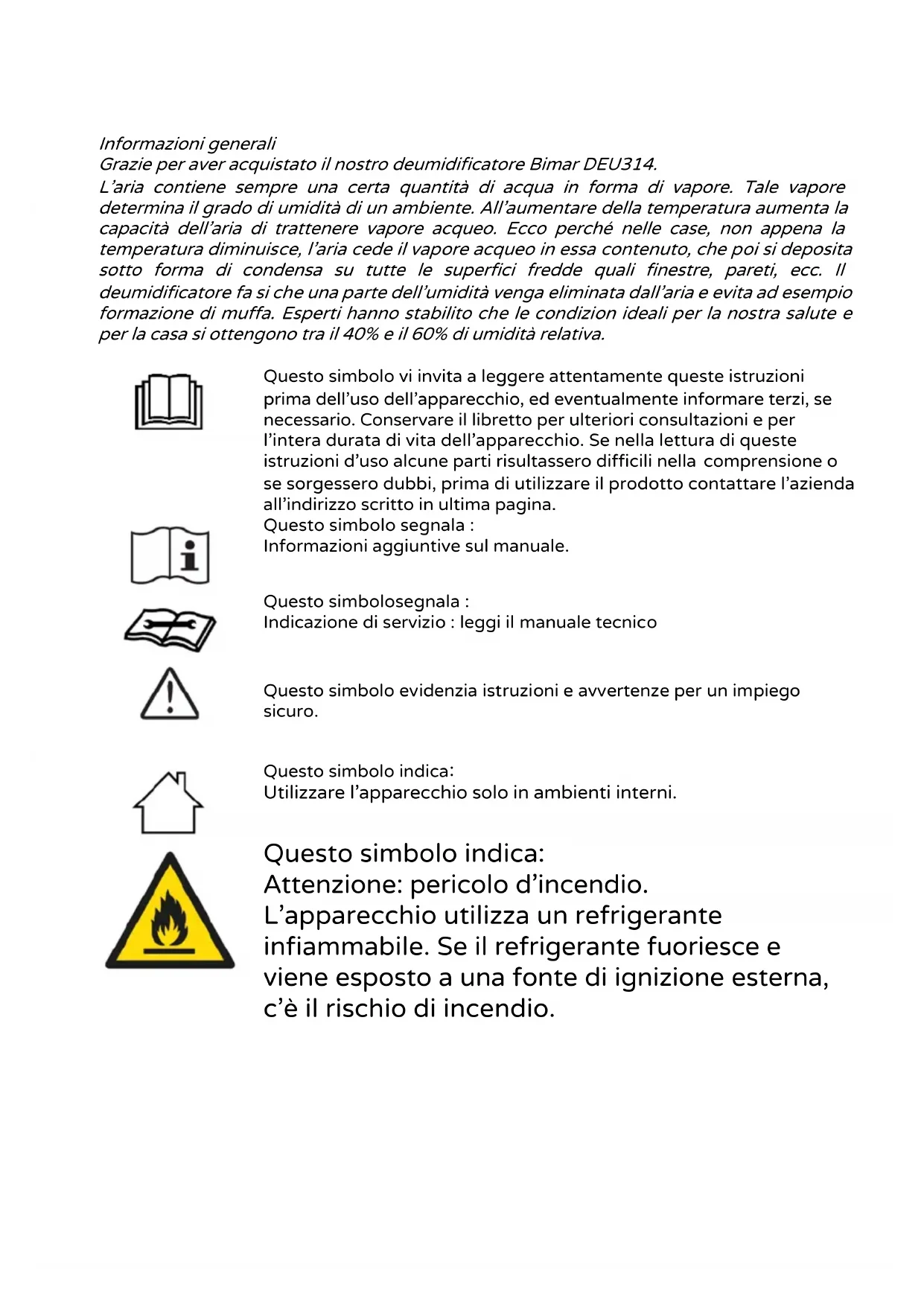 Il filtro aria è intasato. Pulire il filtro come descritto nel paragrafo “Pulizia e manutenzione”. Le finestre e le porte della stanza sono aperte. Chiudere le finestre e le porte della stanza. La temperatura ambiente è troppo bassa. È in corso lo sbrinamento automatico; al termine l’apparecchio tornerà a deumidificare. Il tempo è troppo breve per togliere l’umidità. Aumentare il tempo. La griglia di entrata o uscita dell’aria è coperta o bloccata. Accertarsi che le griglie siano libere. Il deumidificatore è eccessivamente rumoroso. Il deumidificatore non è posizionato correttamente è inclinato e/o traballante. Posizionare il deumidificatore su una superficie piana e stabile. Il filtro aria è intasato o non correttamente inserito nelle proprie guide. Pulire il filtro come descritto nel paragrafo “Pulizia e manutenzione”. Verificare che sia alloggiato all’interno delle proprie guideGeneral Information Thank you for buying our Bimar DEU314 dehumidifier. Air contains a certain amount of water in the form of vapour. This vapour determines the degree of humidity in a particular environment. As the temperature goes up, the capacity of the air to hold water vapour increases. This is why as soon as the temperature in the house drops, the air releases the water vapour that is in it, which is then deposited as condensation on cold surfaces, such as windows, walls, etc. The dehumidifier gets rid of part of the humidity from the air and stops, for example, mould or mildew forming. According to experts, the ideal conditions for our health and for the home are between 40% and 60% relative humidity.