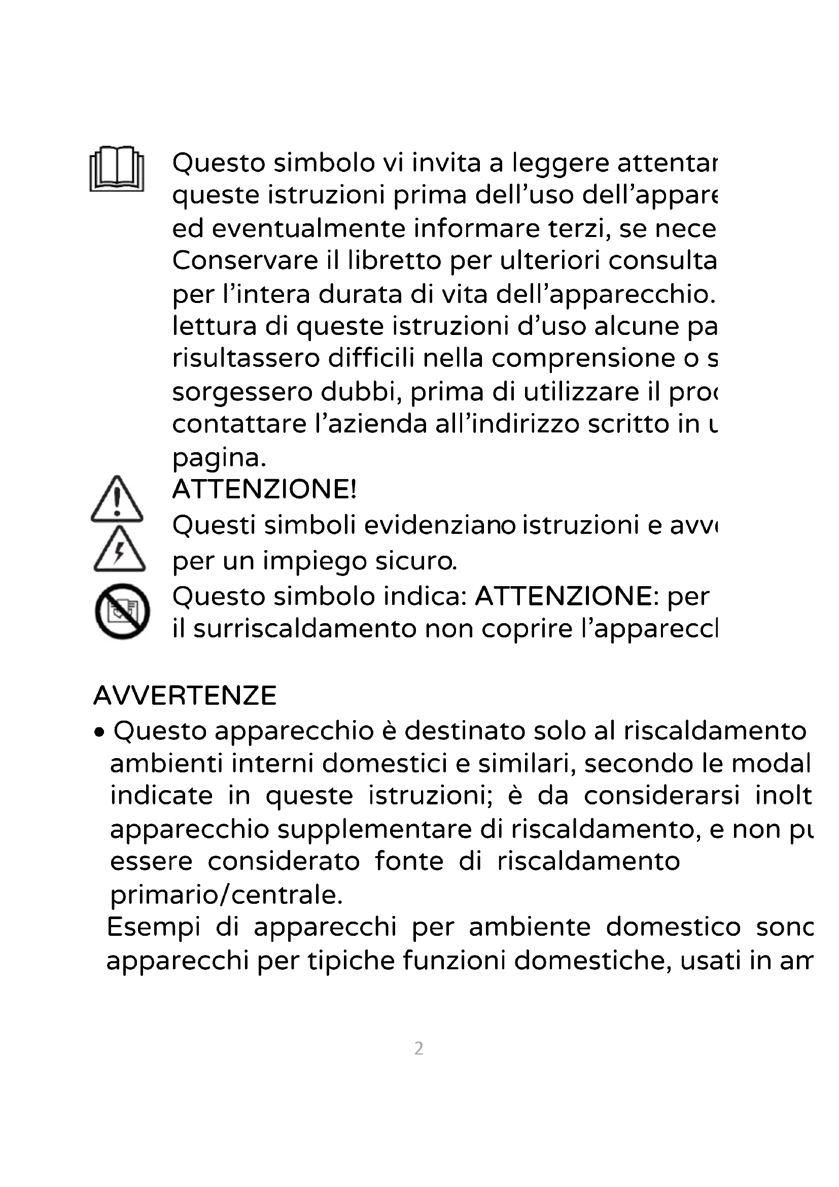 Questo simbolo vi invita a leggere attentamente queste istruzioni prima dell’uso dell’apparecchio, ed eventualmente informare terzi, se necessario. Conservare il libretto per ulteriori consultazioni e per l’intera durata di vita dell’apparecchio. Se nella lettura di queste istruzioni d’uso alcune parti risultassero difficili nella comprensione o se sorgessero dubbi, prima di utilizzare il prodotto contattare l’azienda all’indirizzo scritto in ultima pagina.