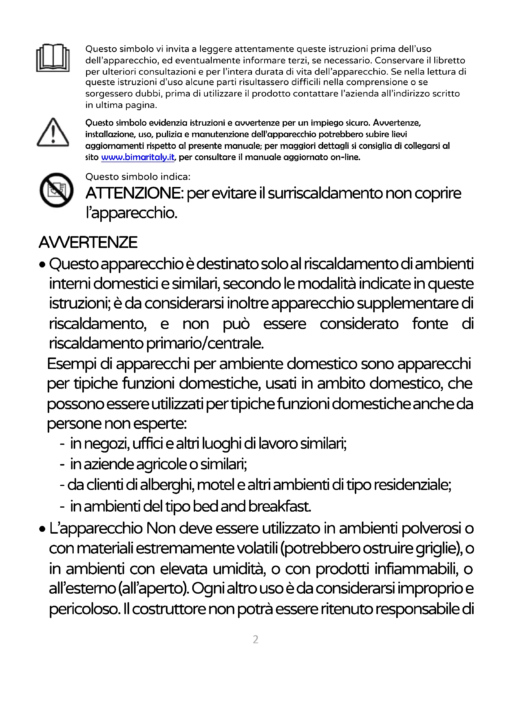 Questo simbolo evidenzia istruzioni e avvertenze per un impiego sicuro. Avvertenze, installazione, uso, pulizia e manutenzione dell’apparecchio potrebbero subire lievi aggiornamenti rispetto al presente manuale; per maggiori dettagli si consiglia di collegarsi al sito www.bimaritaly.it, per consultare il manuale aggiornato on-line.