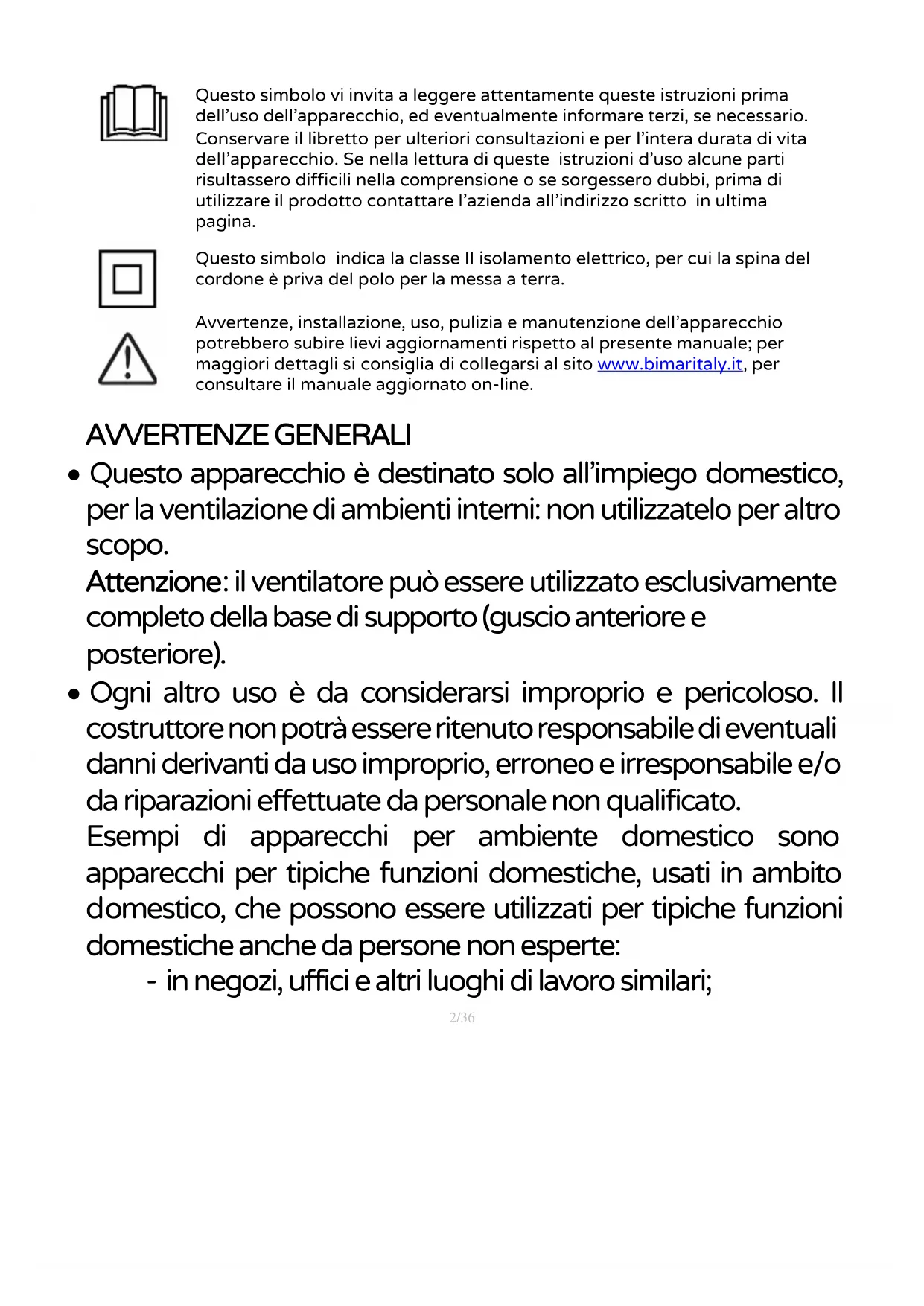 Questo simbolo indica la classe II isolamento elettrico, per cui la spina del cordone è priva del polo per la messa a terra. Avvertenze, installazione, uso, pulizia e manutenzione dell’apparecchio potrebbero subire lievi aggiornamenti rispetto al presente manuale; per maggiori dettagli si consiglia di collegarsi al sito www.bimaritaly.it , per consultare il manuale aggiornato on-line.