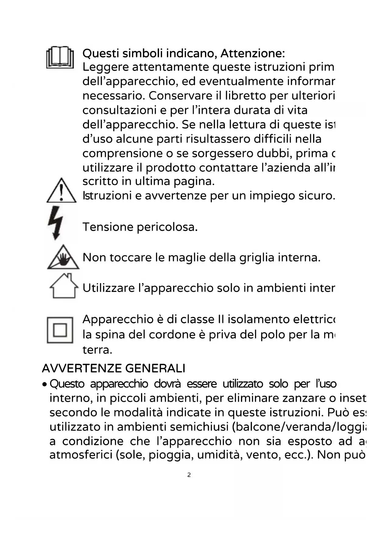 Questi simboli indicano, Attenzione: Leggere attentamente queste istruzioni prima dell’uso dell’apparecchio, ed eventualmente informare terzi, se necessario. Conservare il libretto per ulteriori consultazioni e per l’intera durata di vita dell’apparecchio. Se nella lettura di queste istruzioni d’uso alcune parti risultassero difficili nella comprensione o se sorgessero dubbi, prima di utilizzare il prodotto contattare l’azienda all’indirizzo scritto in ultima pagina. Istruzioni e avvertenze per un impiego sicuro. Tensione pericolosa. Non toccare le maglie della griglia interna. Utilizzare l’apparecchio solo in ambienti interni. Apparecchio è di classe II isolamento elettrico, per cui la spina del cordone è priva del polo per la messa a terra. AVVERTENZE GENERALI Questo apparecchio dovrà essere utilizzato solo per l’uso interno, in piccoli ambienti, per eliminare zanzare o insetti simili secondo le modalità indicate in queste istruzioni. Può essere utilizzato in ambienti semichiusi (balcone/veranda/loggia,), solo a condizione che l’apparecchio non sia esposto ad agenti atmosferici (sole, pioggia, umidità, vento, ecc.). Non può essere3 utilizzato per granai, stalle o luoghi simili. Ogni altro uso è da considerarsi improprio e pericoloso. Il costruttore non potrà essere ritenuto responsabile di eventuali danni derivanti da uso improprio, erroneo e irresponsabile e/o da riparazioni effettuate da personale non qualificato. Non deve essere utilizzato in ambienti esterni (all’aperto). Non toccare con mani o altre parti del corpo ed introdurre mai alcun utensile o metallo attraverso le maglie della griglia interna per non ricevere scosse elettriche. In caso di caduta o cattivo funzionamento, scollegare immediatamente il cordone elettrico. Verificare che nessuna parte sia danneggiata (lampada, griglia ecc.), e dopo questi accertamenti accenderlo: in caso di dubbio rivolgersi a personale professionalmente qualificato. L’apparecchio può essere utilizzato da bambini di età non inferiore a 8 anni e da persone con ridotte capacità fisiche, sensoriali o mentali, o prive di esperienza o della necessaria conoscenza, purchè sotto sorveglianza oppure dopo che le stesse abbiano ricevuto istruzioni relative all’uso sicuro dell’apparecchio e alla comprensione dei pericoli ad esso inerenti. I bambini non devono giocare con l’apparecchio. La pulizia e la manutenzione destinata ad essere effettuata dall’utilizzatore non deve essere effettuata da bambini senza sorveglianza. L’apparecchio deve essere mantenuto fuori dalla portata di bambini. Attenzione: quando si utilizzano apparecchi elettrici, occorre sempre rispettare le precauzioni di sicurezza di base per evitare i rischi di incendio, di scosse elettriche e di lesioni fisiche.4 Non toccare l’apparecchio con mani o piedi bagnati. Non lasciare l’apparecchio esposto agli agenti atmosferici (sole, pioggia, ecc.). Non spostare l’apparecchio durante il funzionamento. Non usare l’apparecchio se non funziona correttamente o se sembra danneggiato; in caso di dubbio rivolgersi a personale professionalmente qualificato. Scollegare sempre l’apparecchio dalla presa di corrente prima di pulire l’apparecchio. Se l’apparecchio non è in funzione togliere la spina dalla presa di corrente. Non tirare il cavo di alimentazione o l’apparecchio stesso per disinserire la spina dalla presa di corrente. Se il cavo di alimentazione, lampada o altre parti dell’apparecchio sono danneggiate, devono essere sostituite dal costruttore o dal suo servizio assistenza tecnica o comunque da una persona con qualifica similare, in modo da prevenire ogni rischio. L’apparecchio non può essere utilizzato in luoghi dove ci sono materiali infiammabili, polveri esplosive o simili. Questo apparecchio non è destinato a essere fatto funzionare per mezzo di un temporizzatore esterno o con un sistema di comando a distanza separato, per evitare il rischio di incendio nel caso l’apparecchio sia coperto o sia posizionato in modo non corretto. La lampada della zanzariera non può essere sostituita, smaltire l’apparecchio nel rispetto delle norme vigenti quando la lampada non funziona.5 Non utilizzare l’apparecchio nelle immediate vicinanze di una vasca da bagno, di una doccia o di una piscina lavandini, ecc; né in luoghi dove possa subire urti. Attenzione: non coprire l’apparecchio, se in funzione, per evitare rischi d’incendio. INSTALLAZIONE Dopo aver tolto l’imballaggio, assicurarsi dell’integrità dell’apparecchio; in caso di dubbio non utilizzarlo e rivolgersi a personale professionalmente qualificato. Gli elementi d’imballaggio (sacchetti di plastica, polistirolo espanso, chiodi, ecc.) non devono essere lasciati alla portata di mano di bambini in quanto potenziali fonti di pericolo, ma vanno smaltiti secondo le norme vigenti negli appositi contenitori per la raccolta differenziata. Prima di collegare l’apparecchio accertarsi che i dati di targa (tensione, ecc..) corrispondano a quelli della vostra rete di distribuzione elettrica. In generale è sconsigliato l’uso di adattatori, prese multiple e/o prolunghe; se il loro uso si rendesse indispensabile, devono essere conformi alle vigenti norme di sicurezza e la portata in corrente (ampères) non deve essere inferiore a quella massima dell’apparecchio. Prima di ogni utilizzo verificare che l’apparecchio sia in buono stato, che il cordone elettrico non sia danneggiato: in caso di dubbio rivolgersi a personale professionalmente qualificato. La presa di corrente deve essere facilmente accessibile in modo da poter disinserire con facilità la spina in caso di emergenza. Appendere l’apparecchio in ambienti interni tramite l’apposito anello. Nell’evenienza, appoggiarlo su una superficie piana ben stabile, orizzontale. Posizionarlo lontano da altre fonti di calore, bordi taglienti, finestre, da materiali infiammabili (tende, tappezzerie, ecc.), da gas infiammabili o b