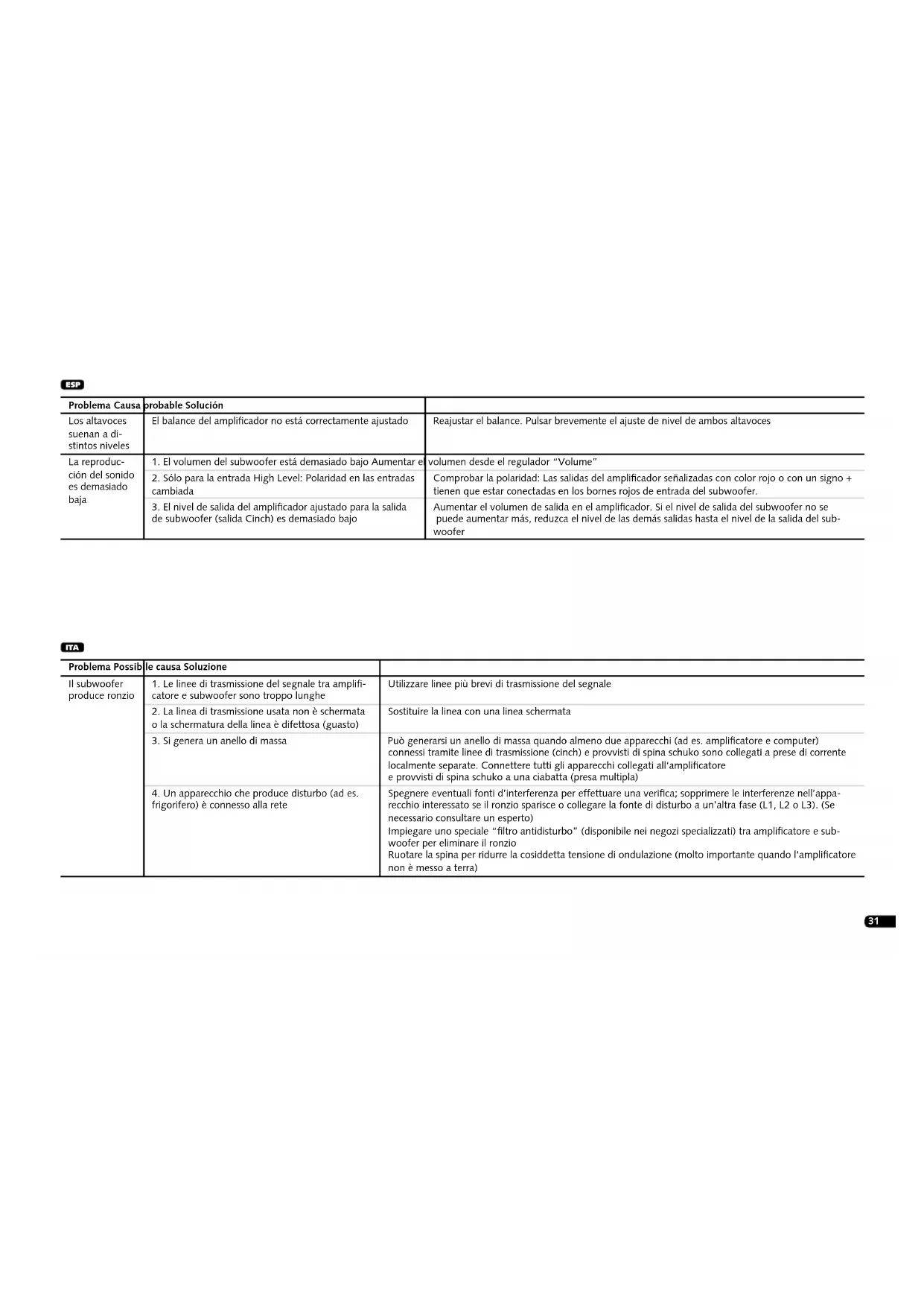 frigorifero) è connesso alla rete Spegnere eventuali fonti d’interferenza per effettuare una verifica; sopprimere le interferenze nell’appa- recchio interessato se il ronzio sparisce o collegare la fonte di disturbo a un’altra fase (L1, L2 o L3). (Se necessario consultare un esperto) Impiegare uno speciale “ltro antidisturbo” (disponibile nei negozi specializzati) tra amplicatore e sub- woofer per eliminare il ronzio Ruotare la spina per ridurre la cosiddetta tensione di ondulazione (molto importante quando l‘amplificatore non è messo a terra) ITA32 ITA Problema Possibile causa Soluzione I diffusori riprodu- cono i suoni con potenze diverse Impostazione errata del livello dell’amplificatore Correggere il livello dell’amplificatore (a tal scopo consultare le istruzioni d’uso dell’apparecchio) Il volume della riproduzione è troppo basso