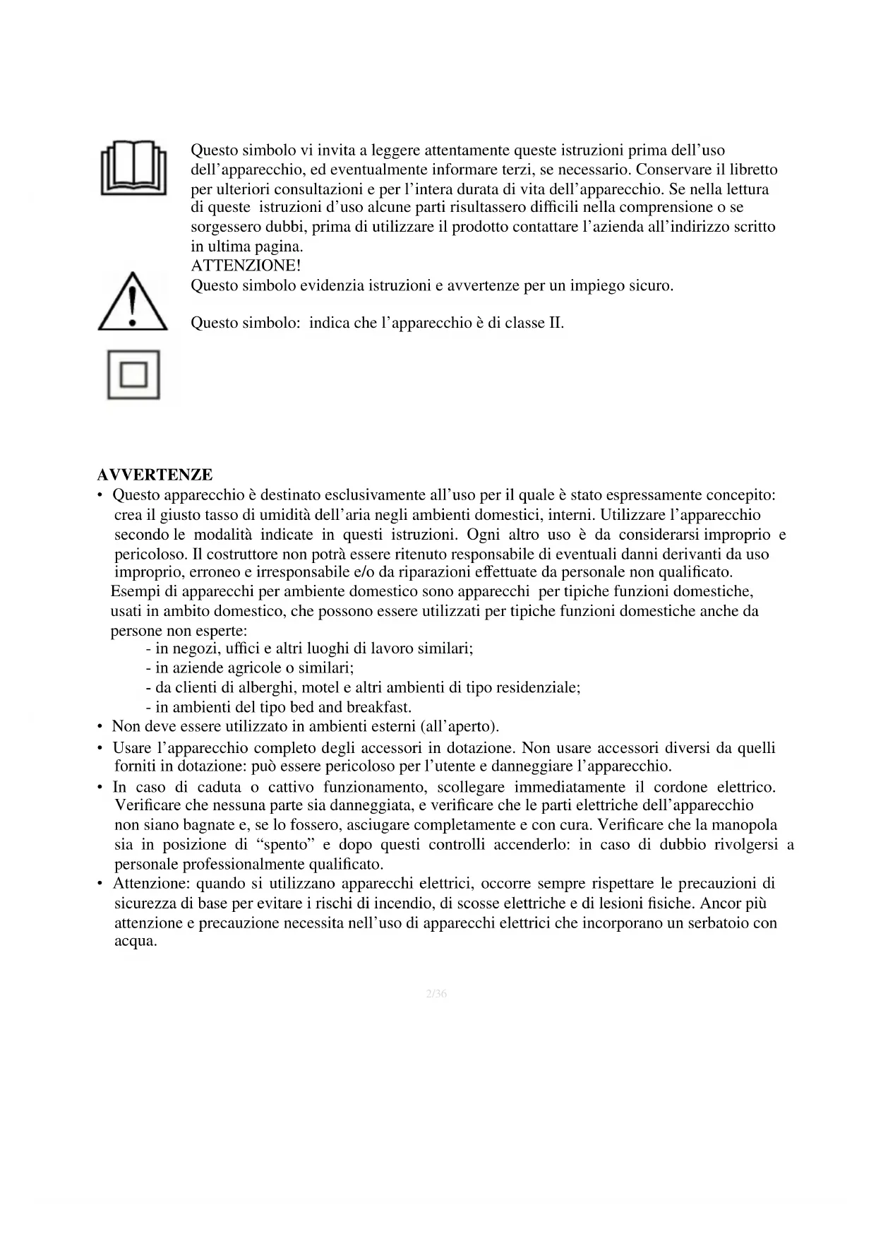 Questo simbolo vi invita a leggere attentamente queste istruzioni prima dell’uso dell’apparecchio, ed eventualmente informare terzi, se necessario. Conservare il libretto per ulteriori consultazioni e per l’intera durata di vita dell’apparecchio. Se nella lettura di queste istruzioni d’uso alcune parti risultassero difficili nella comprensione o se sorgessero dubbi, prima di utilizzare il prodotto contattare l’azienda all’indirizzo scritto in ultima pagina. ATTENZIONE! Questo simbolo evidenzia istruzioni e avvertenze per un impiego sicuro. Questo simbolo: indica che l’apparecchio è di classe II.3/36