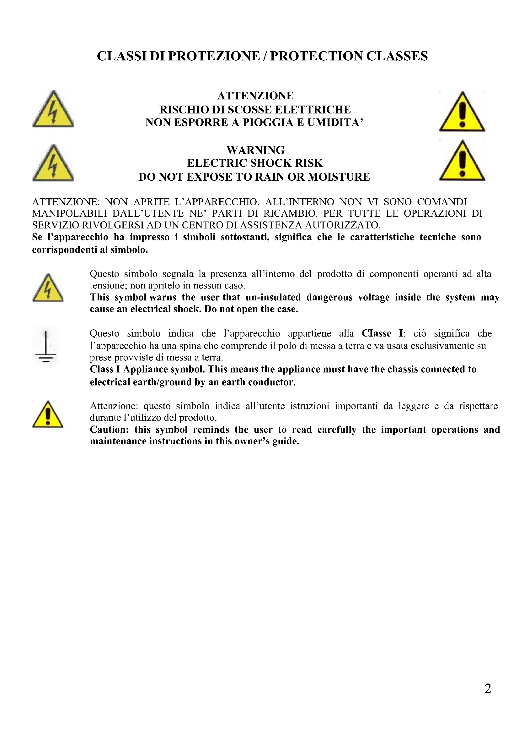 DO NOT EXPOSE TO RAIN OR MOISTURE ATTENZIONE: NON APRITE L’APPARECCHIO. ALL’INTERNO NON VI SONO COMANDI MANIPOLABILI DALL’UTENTE NE’ PARTI DI RICAMBIO. PER TUTTE LE OPERAZIONI DI SERVIZIO RIVOLGERSI AD UN CENTRO DI ASSISTENZA AUTORIZZATO. Se l’apparecchio ha impresso i simboli sottostanti, significa che le caratteristiche tecniche sono corrispondenti al simbolo. Questo simbolo segnala la presenza all’interno del prodotto di componenti operanti ad alta tensione; non apritelo in nessun caso. This symbol warns the user that un-insulated dangerous voltage inside the system may cause an electrical shock. Do not open the case. Questo simbolo indica che l’apparecchio appartiene alla CIasse I: ciò significa che l’apparecchio ha una spina che comprende il polo di messa a terra e va usata esclusivamente su prese provviste di messa a terra. Class I Appliance symbol. This means the appliance must have the chassis connected to electrical earth/ground by an earth conductor. Attenzione: questo simbolo indica all’utente istruzioni importanti da leggere e da rispettare durante l’utilizzo del prodotto. Caution: this symbol reminds the user to read carefully the important operations and maintenance instructions in this owner’s guide.3