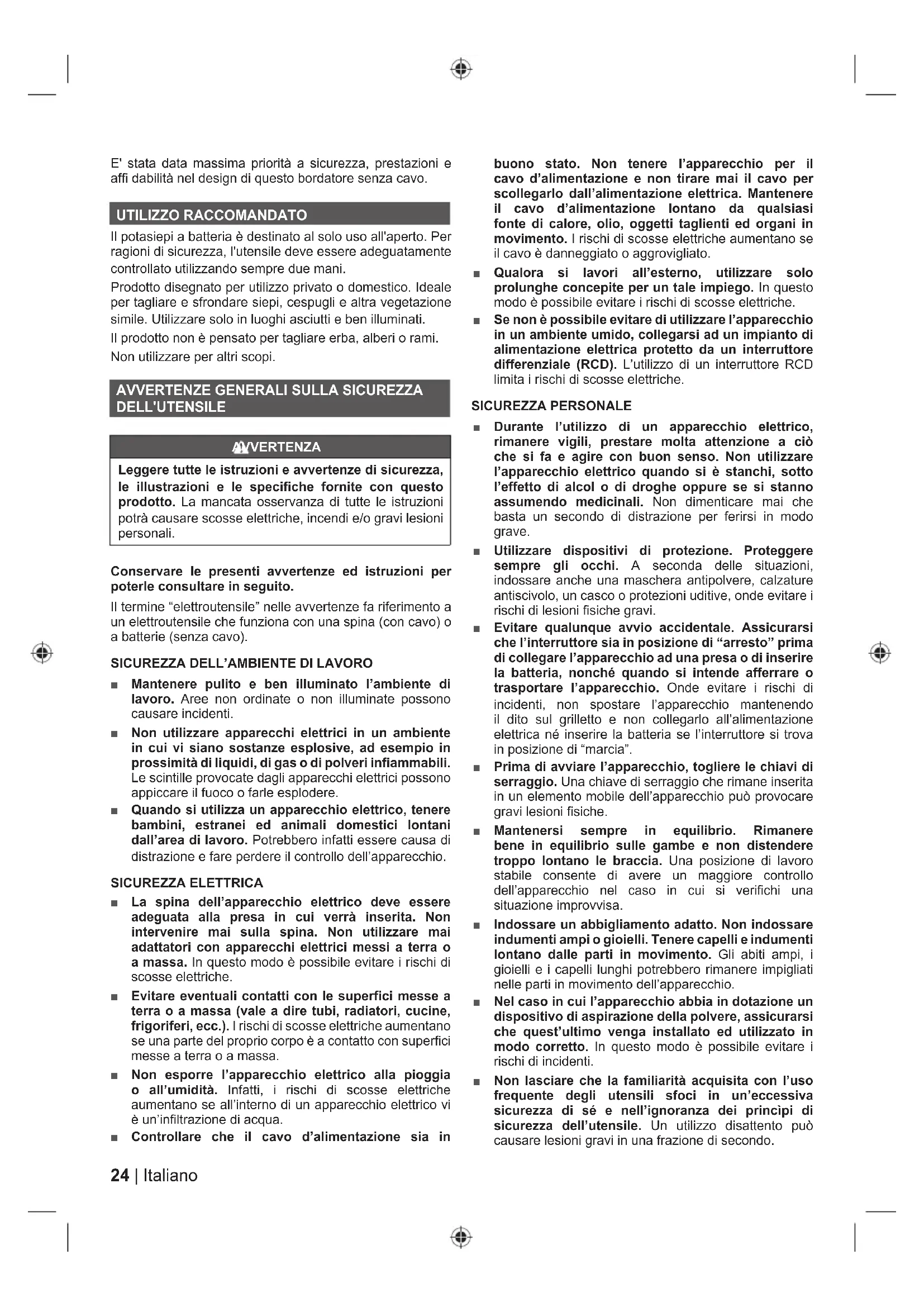 ADVERTENCIA Indica una situación peligrosa que, de no evitarse, puede ocasionar la muerte o heridas de gravedad. ADVERTENCIA Indica una situación potencialmente peligrosa que, de no evitarse, puede ocasionar heridas leves. ADVERTENCIA Sin símbolo de alerta de seguridad Indica una situación que puede causar daños en las cosas.24 | Italiano E' stata data massima priorità a sicurezza, prestazioni e affi dabilità nel design di questo bordatore senza cavo. UTILIZZO RACCOMANDATO Il potasiepi a batteria è destinato al solo uso all'aperto. Per ragioni di sicurezza, l'utensile deve essere adeguatamente controllato utilizzando sempre due mani. Prodotto disegnato per utilizzo privato o domestico. Ideale per tagliare e sfrondare siepi, cespugli e altra vegetazione simile. Utilizzare solo in luoghi asciutti e ben illuminati. Il prodotto non è pensato per tagliare erba, alberi o rami. Non utilizzare per altri scopi.