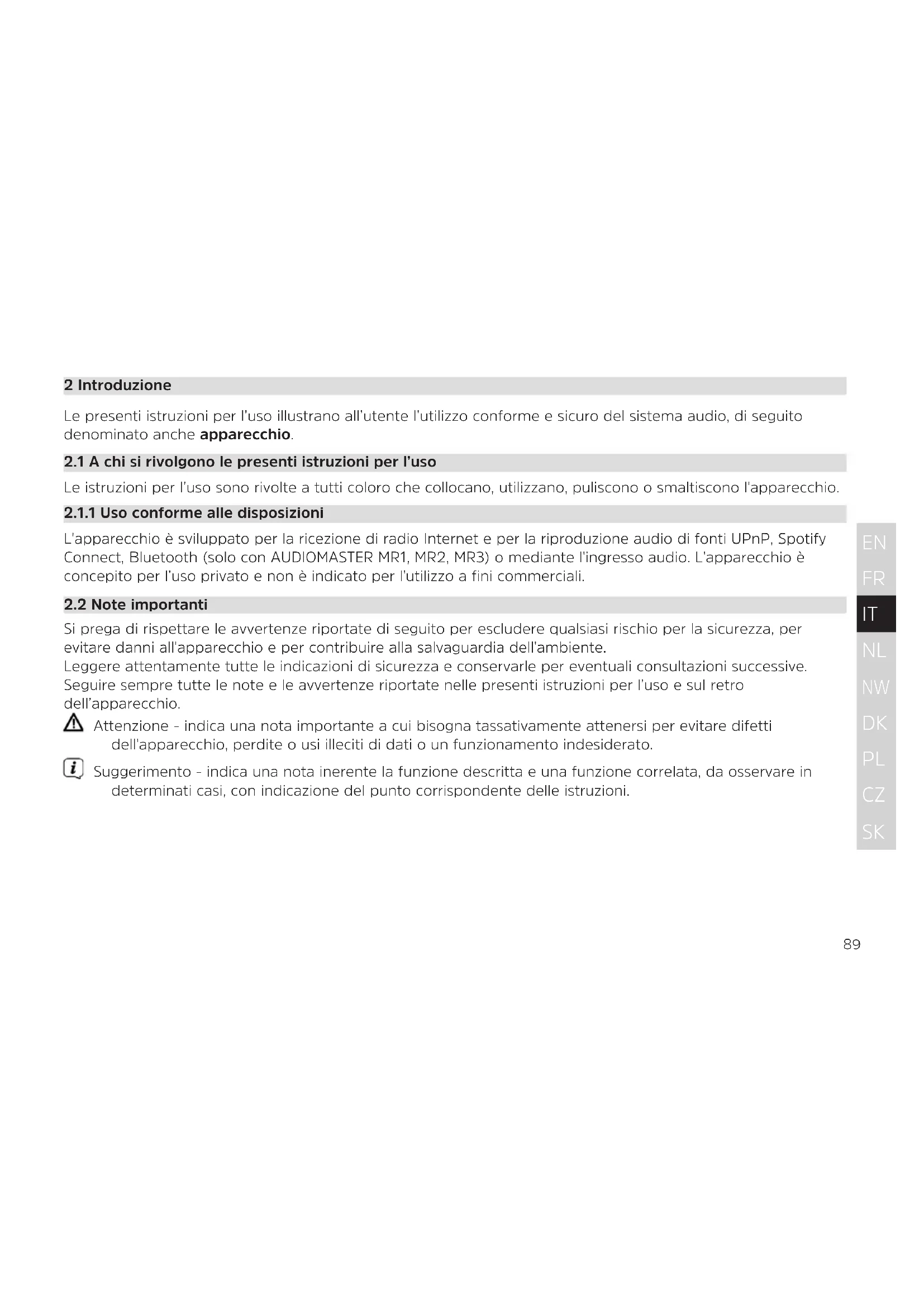 2 Introduzione Le presenti istruzioni per l’uso illustrano all’utente l’utilizzo conforme e sicuro del sistema audio, di seguito denominato anche apparecchio.