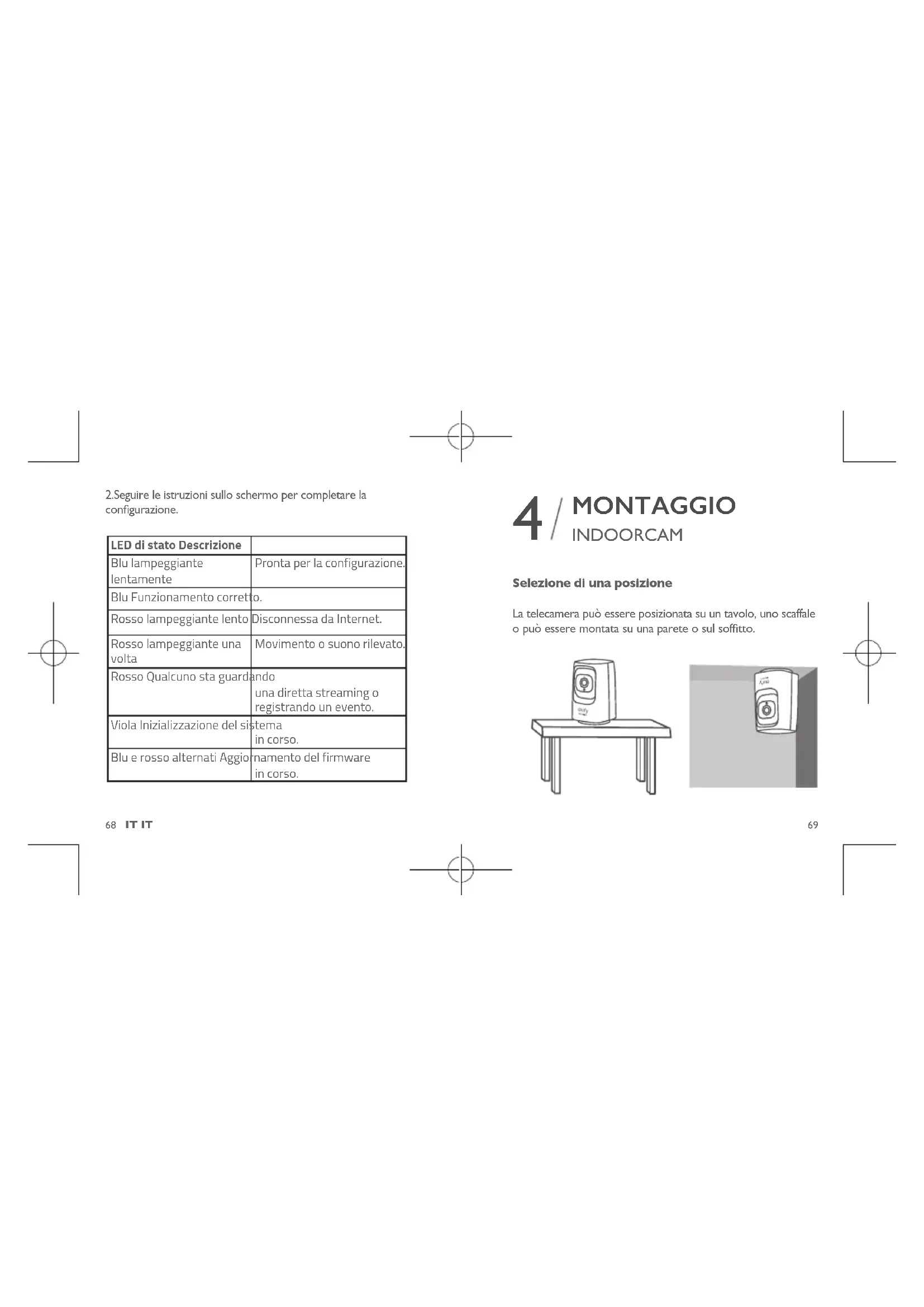 2.Seguire le istruzioni sullo schermo per completare la congurazione. LED di stato Descrizione Blu lampeggiante lentamente Pronta per la configurazione. Blu Funzionamento corretto. Rosso lampeggiante lento Disconnessa da Internet. Rosso lampeggiante una volta Movimento o suono rilevato. Rosso Qualcuno sta guardando una diretta streaming o registrando un evento. Viola Inizializzazione del sistema in corso. Blu e rosso alternati Aggiornamento del firmware in corso. INDOORCAM MONTAGGIO