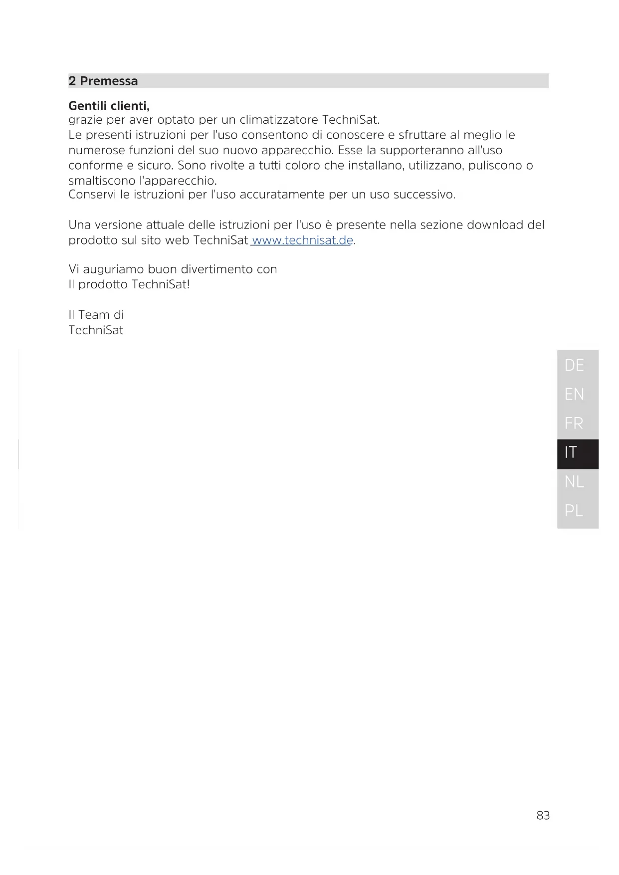 2 Premessa Gentili clienti, grazie per aver optato per un climatizzatore TechniSat. Le presenti istruzioni per l'uso consentono di conoscere e sfruare al meglio le numerose funzioni del suo nuovo apparecchio. Esse la supporteranno all'uso conforme e sicuro. Sono rivolte a tui coloro che installano, utilizzano, puliscono o smaltiscono l'apparecchio. Conservi le istruzioni per l'uso accuratamente per un uso successivo. Una versione auale delle istruzioni per l'uso è presente nella sezione download del prodoo sul sito web TechniSat www.technisat.de. Vi auguriamo buon divertimento con Il prodoo TechniSat! Il Team di TechniSat84 3 Avvertenze di sicurezza