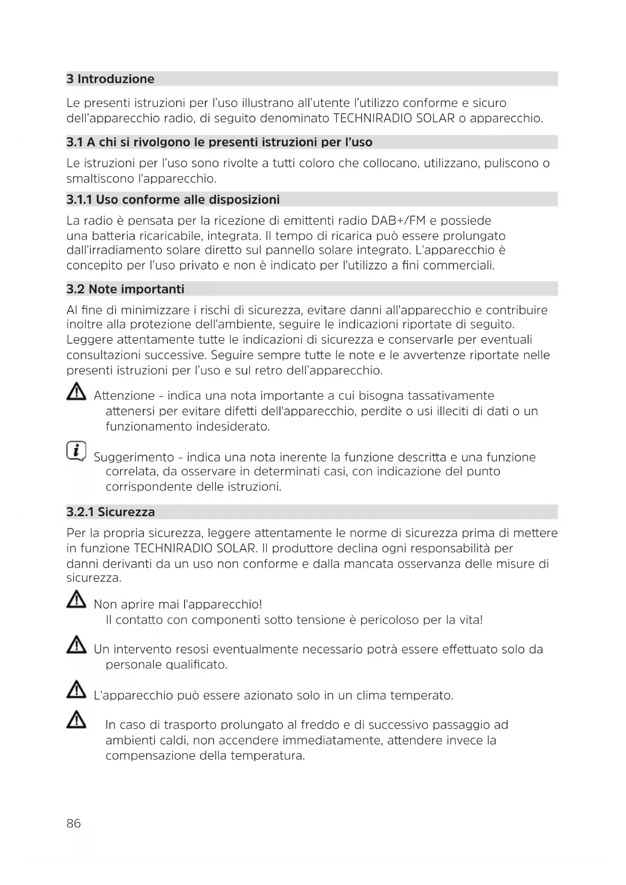 Per la propria sicurezza, leggere aentamente le norme di sicurezza prima di meere in funzione TECHNIRADIO SOLAR. Il produore declina ogni responsabilità per danni derivanti da un uso non conforme e dalla mancata osservanza delle misure di sicurezza. Non aprire mai l'apparecchio! Il contao con componenti soo tensione è pericoloso per la vita! Un intervento resosi eventualmente necessario potrà essere eeuato solo da personale qualificato. L'apparecchio può essere azionato solo in un clima temperato. In caso di trasporto prolungato al freddo e di successivo passaggio ad ambienti caldi, non accendere immediatamente, aendere invece la compensazione della temperatura.87