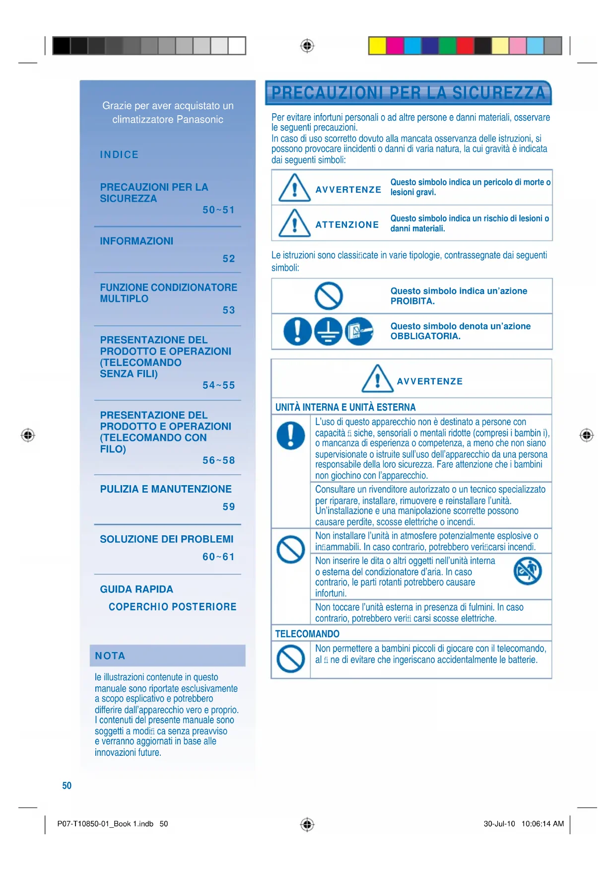 - Entfernen Sie die Batterien aus der Fernbedienung (kabellose Fernbedienung) P07-T10850-01_Book 1.indb 49P07-T10850-01_Book 1.indb 49 30-Jul-10 10:06:14 AM30-Jul-10 10:06:14 AM50 Per evitare infortuni personali o ad altre persone e danni materiali, osservare le seguenti precauzioni. In caso di uso scorretto dovuto alla mancata osservanza delle istruzioni, si possono provocare iincidenti o danni di varia natura, la cui gravità è indicata dai seguenti simboli: AVVERTENZE AVVERTENZE Questo simbolo indica un pericolo di morte o lesioni gravi. ATTENZIONE ATTENZIONE Questo simbolo indica un rischio di lesioni o danni materiali. Le istruzioni sono classifi cate in varie tipologie, contrassegnate dai seguenti simboli: Questo simbolo indica un’azione PROIBITA. Questo simbolo denota un’azione OBBLIGATORIA. Grazie per aver acquistato un climatizzatore Panasonic INDICE INDICE