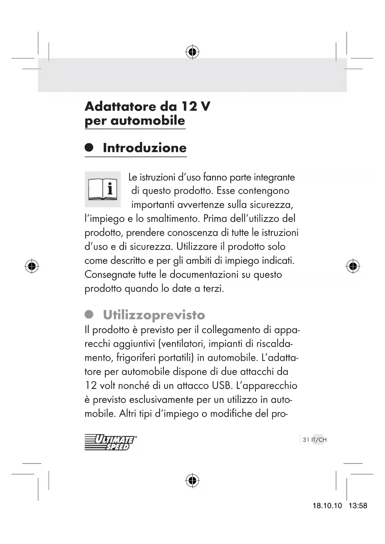 Utilizzo previsto Il prodotto è previsto per il collegamento di appa- recchi aggiuntivi (ventilatori, impianti di riscalda- mento, frigoriferi portatili) in automobile. L’adatta- tore per automobile dispone di due attacchi da 12 volt nonché di un attacco USB. L’apparecchio è previsto esclusivamente per un utilizzo in auto- mobile. Altri tipi d‘impiego o modifiche del pro-