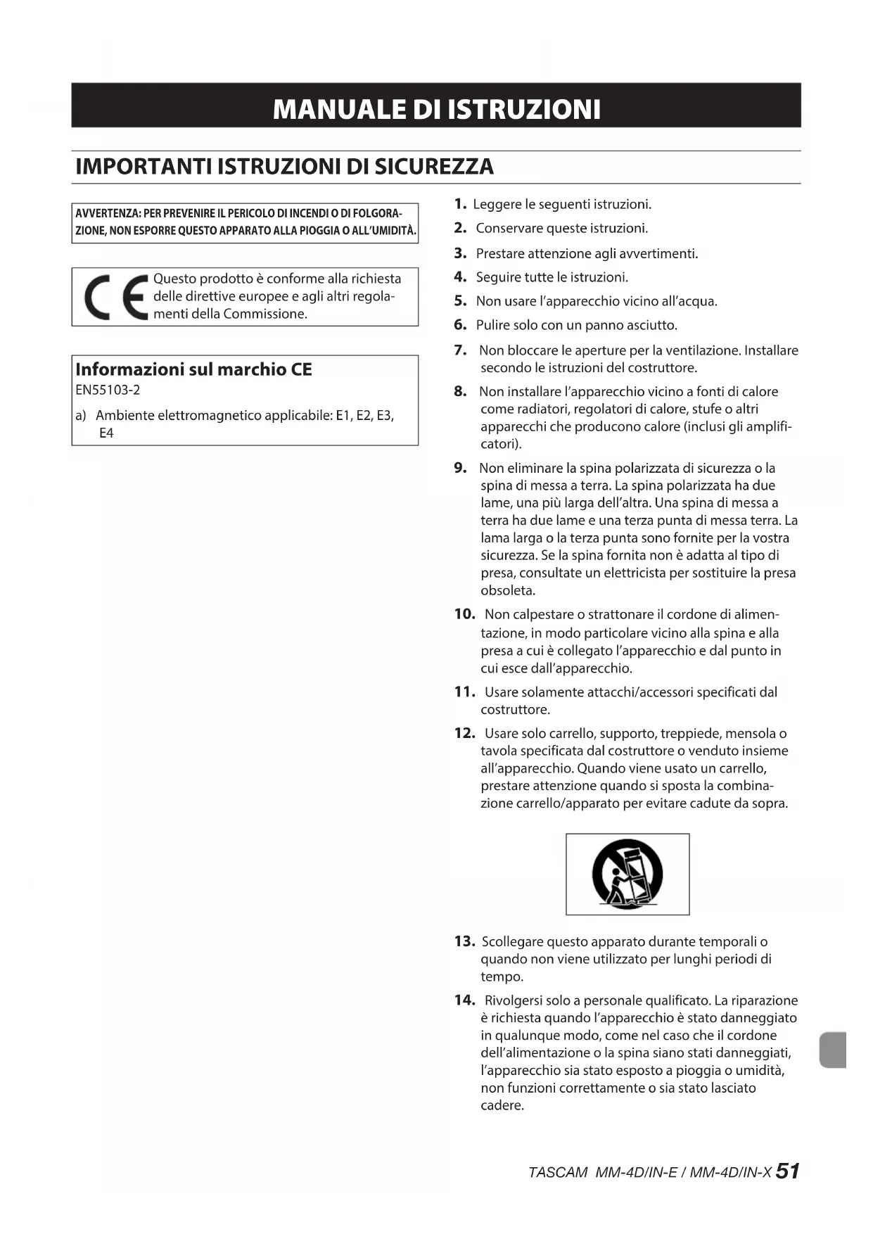 - CAUTELA per i prodotti che utilizzano batterie al litio sostituibili: vi è pericolo di esplosione se la batteria viene sostituita con una di tipo scorretto. Sostituire solo con tipo uguale o equivalente. Per i clienti europei Smaltimento di apparecchiature elettriche ed elettroniche e/o accumulatori (a) Tutte le apparecchiature elettriche ed elettroniche, batterie scariche e/o accumulatori devono essere smaltite separatamente dai riuti urbani mediante impianti di raccolta specici designati dal governo o dalle autorità locali. (b) Lo smaltimento in modo corretto delle apparecchiature elettriche ed elettroniche, batterie e accumulatori contribuisce a risparmiare preziose risorse ed evitare potenziali eetti negativi sulla salute umana e l’ambiente. (c) Lo smaltimento non corretto di apparecchiature e/o batterie/accumulatori può avere gravi conseguenze sull’ambiente e sulla salute umana come risultato della presenza di sostanze pericolose nelle apparecchiature elettriche ed elettroniche. (d) Il simbolo RAEE, che mostra un bidone della spazzatura sbarrato, indica che le apparec- chiature elettriche/elettroniche e le batterie e/o accumulatori devono essere raccolti e smaltiti separatamente dai rifiuti domestici. Se una batteria o un accumulatore contiene più dei valori specificati di piombo (Pb), mercurio (Hg) e/o cadmio (Cd) come definito nella direttiva sulla batteria (2006/66/CE), allora i simboli chimici di tali elementi sarà indicato sotto il simbolo RAEE. (e) I sistemi di raccolta sono a disposizione degli utenti finali. Per informazioni più dettagliate sullo smalti- mento delle vecchie apparecchiature elettriche ed elettroniche e delle batterie/accumulatori , contattare il comune, il servizio di smaltimento rifiuti o il negozio dove è stato acquistato l’apparecchio. Pb, Hg, CdTASCAM MM-4D/IN-E / MM-4D/IN-X
