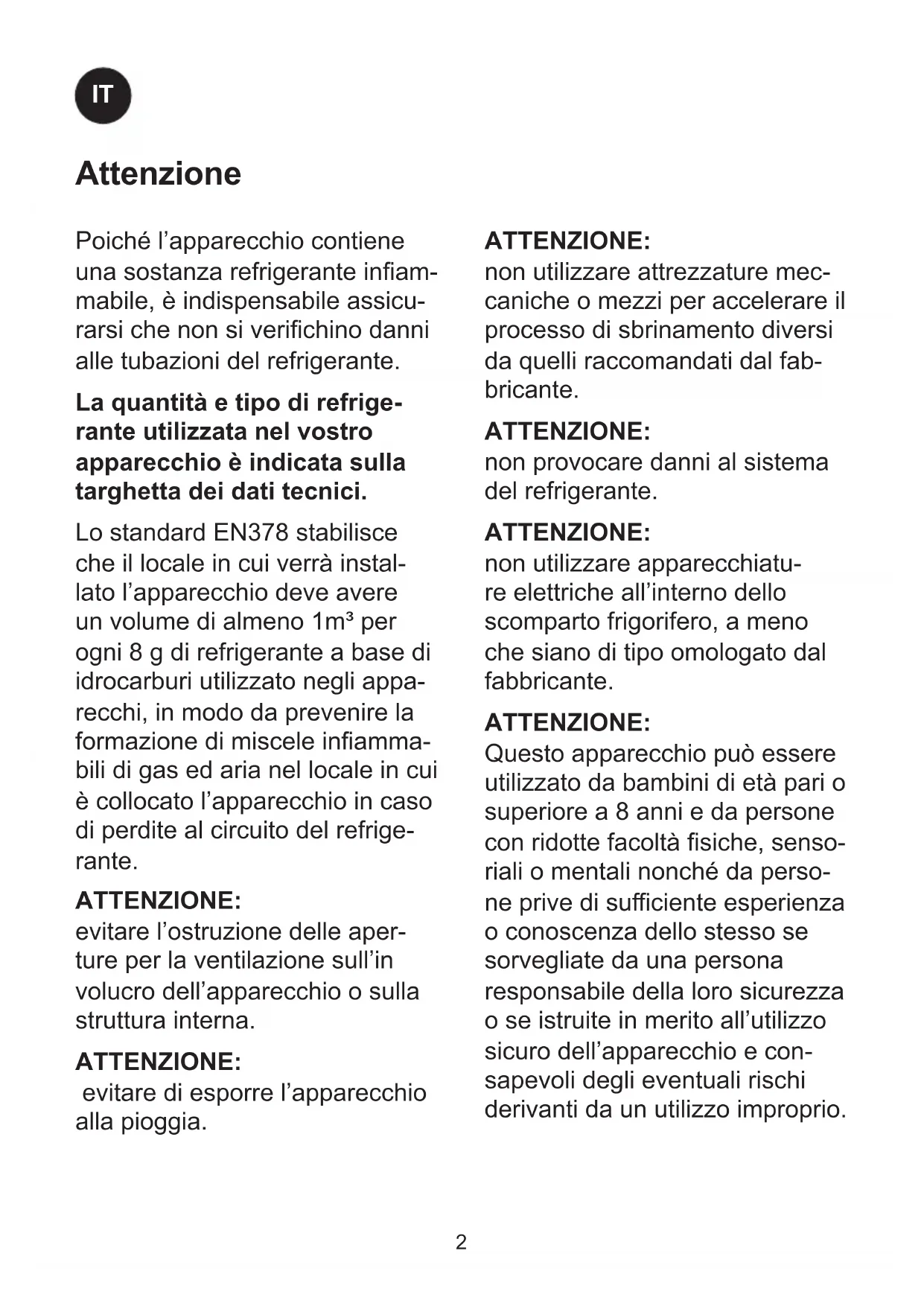Attenzione Poiché l’apparecchio contiene una sostanza refrigerante inam- mabile, è indispensabile assicu- rarsi che non si verichino danni alle tubazioni del refrigerante. La quantità e tipo di refrige- rante utilizzata nel vostro apparecchio è indicata sulla targhetta dei dati tecnici. Lo standard EN378 stabilisce che il locale in cui verrà instal- lato l’apparecchio deve avere un volume di almeno 1m³ per ogni 8 g di refrigerante a base di idrocarburi utilizzato negli appa- recchi, in modo da prevenire la formazione di miscele inamma- bili di gas ed aria nel locale in cui è collocato l’apparecchio in caso di perdite al circuito del refrige- rante. ATTENZIONE: evitare l’ostruzione delle aper- ture per la ventilazione sull’in volucro dell’apparecchio o sulla struttura interna. ATTENZIONE: evitare di esporre l’apparecchio alla pioggia. ATTENZIONE: non utilizzare attrezzature mec- caniche o mezzi per accelerare il processo di sbrinamento diversi da quelli raccomandati dal fab- bricante. ATTENZIONE: non provocare danni al sistema del refrigerante. ATTENZIONE: non utilizzare apparecchiatu- re elettriche all’interno dello scomparto frigorifero, a meno che siano di tipo omologato dal fabbricante. ATTENZIONE: Questo apparecchio può essere utilizzato da bambini di età pari o superiore a 8 anni e da persone con ridotte facoltà siche, senso- riali o mentali nonché da perso- ne prive di suciente esperienza o conoscenza dello stesso se sorvegliate da una persona responsabile della loro sicurezza o se istruite in merito all’utilizzo sicuro dell’apparecchio e con- sapevoli degli eventuali rischi derivanti da un utilizzo improprio.3