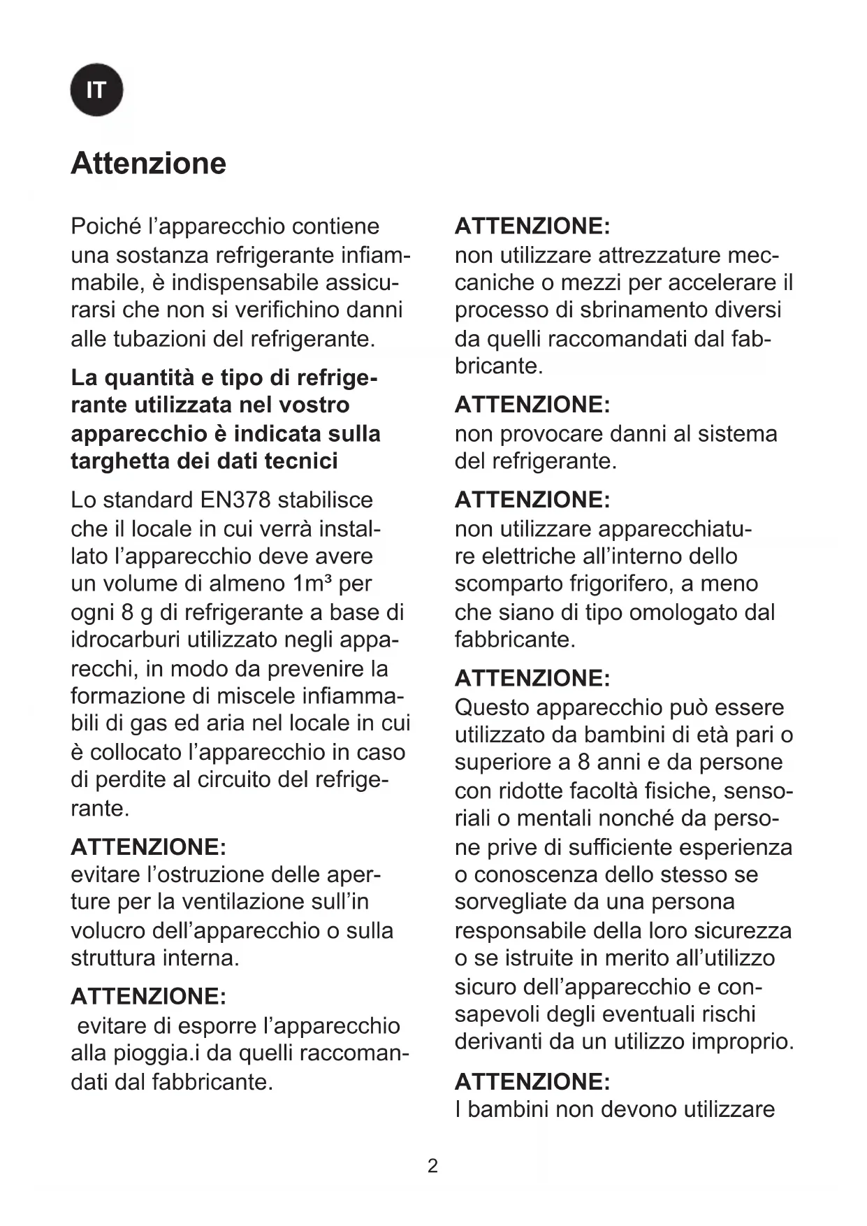 Poiché l’apparecchio contiene una sostanza refrigerante inam- mabile, è indispensabile assicu- rarsi che non si verichino danni alle tubazioni del refrigerante. La quantità e tipo di refrige- rante utilizzata nel vostro apparecchio è indicata sulla targhetta dei dati tecnici Lo standard EN378 stabilisce che il locale in cui verrà instal- lato l’apparecchio deve avere un volume di almeno 1m³ per ogni 8 g di refrigerante a base di idrocarburi utilizzato negli appa- recchi, in modo da prevenire la formazione di miscele inamma- bili di gas ed aria nel locale in cui è collocato l’apparecchio in caso di perdite al circuito del refrige- rante. ATTENZIONE: evitare l’ostruzione delle aper- ture per la ventilazione sull’in volucro dell’apparecchio o sulla struttura interna. ATTENZIONE: evitare di esporre l’apparecchio alla pioggia.i da quelli raccoman- dati dal fabbricante. ATTENZIONE: non utilizzare attrezzature mec- caniche o mezzi per accelerare il processo di sbrinamento diversi da quelli raccomandati dal fab- bricante. ATTENZIONE: non provocare danni al sistema del refrigerante. ATTENZIONE: non utilizzare apparecchiatu- re elettriche all’interno dello scomparto frigorifero, a meno che siano di tipo omologato dal fabbricante. ATTENZIONE: Questo apparecchio può essere utilizzato da bambini di età pari o superiore a 8 anni e da persone con ridotte facoltà siche, senso- riali o mentali nonché da perso- ne prive di suciente esperienza o conoscenza dello stesso se sorvegliate da una persona responsabile della loro sicurezza o se istruite in merito all’utilizzo sicuro dell’apparecchio e con- sapevoli degli eventuali rischi derivanti da un utilizzo improprio. ATTENZIONE: I bambini non devono utilizzare Attenzione3