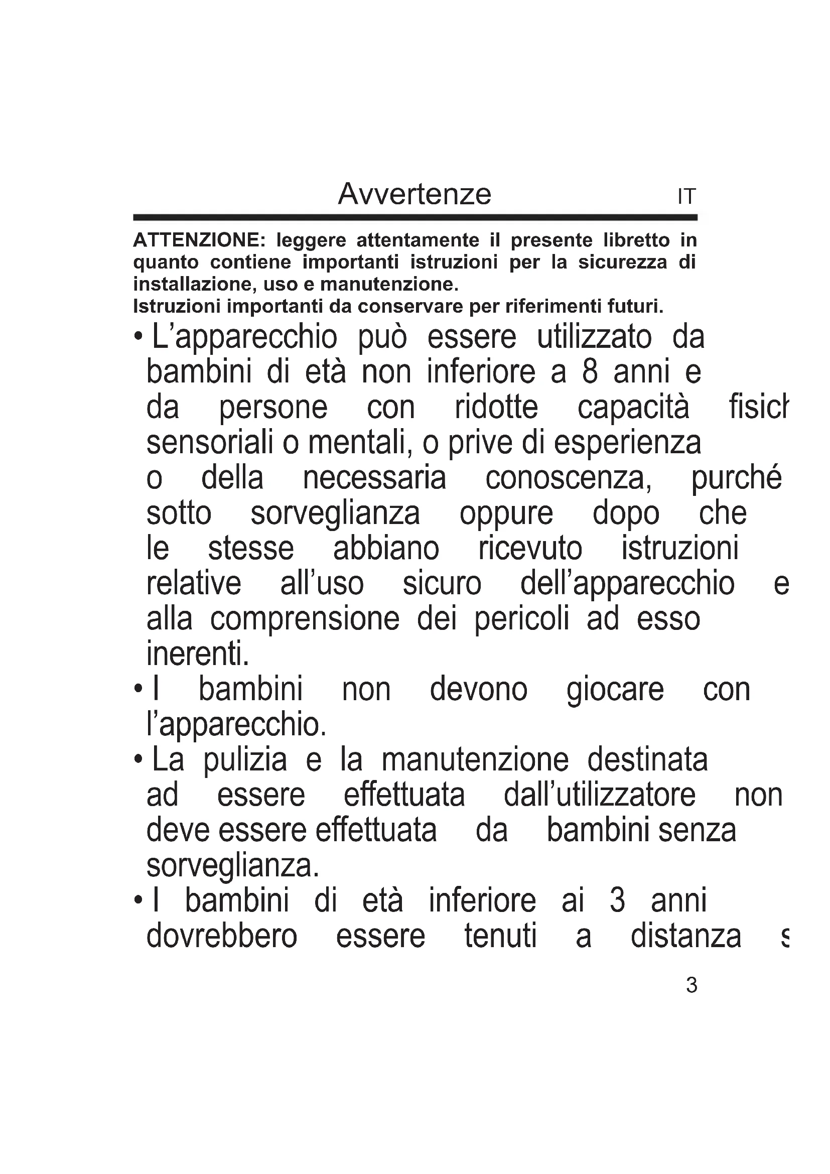 - I bambini di età compresa tra i 3 e gli 8 anni devono solamente accendere/spegnere l’apparecchio purché sia stato posto o installato nella sua normale posizione di funzionamento e che essi ricevano sorveglianza o istruzioni riguardanti l’utilizzo dell’apparecchio in sicurezza e ne capiscano i pericoli.