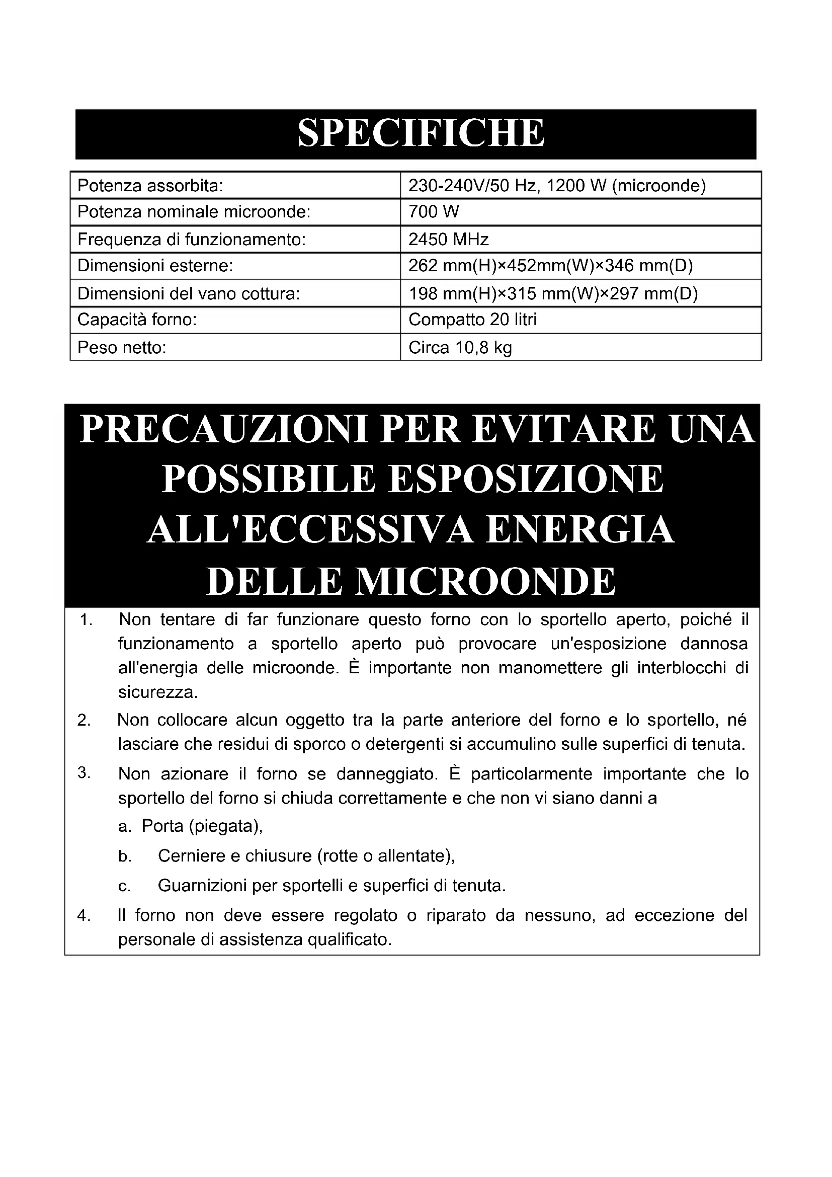 Potenza assorbita: 230-240V/50 Hz, 1200 W (microonde) Potenza nominale microonde: 700 W Frequenza di funzionamento: 2450 MHz Dimensioni esterne: 262 mm(H)×452mm(W)×346 mm(D) Dimensioni del vano cottura: 198 mm(H)×315 mm(W)×297 mm(D) Capacità forno: Compatto 20 litri Peso netto: Circa 10,8 kg