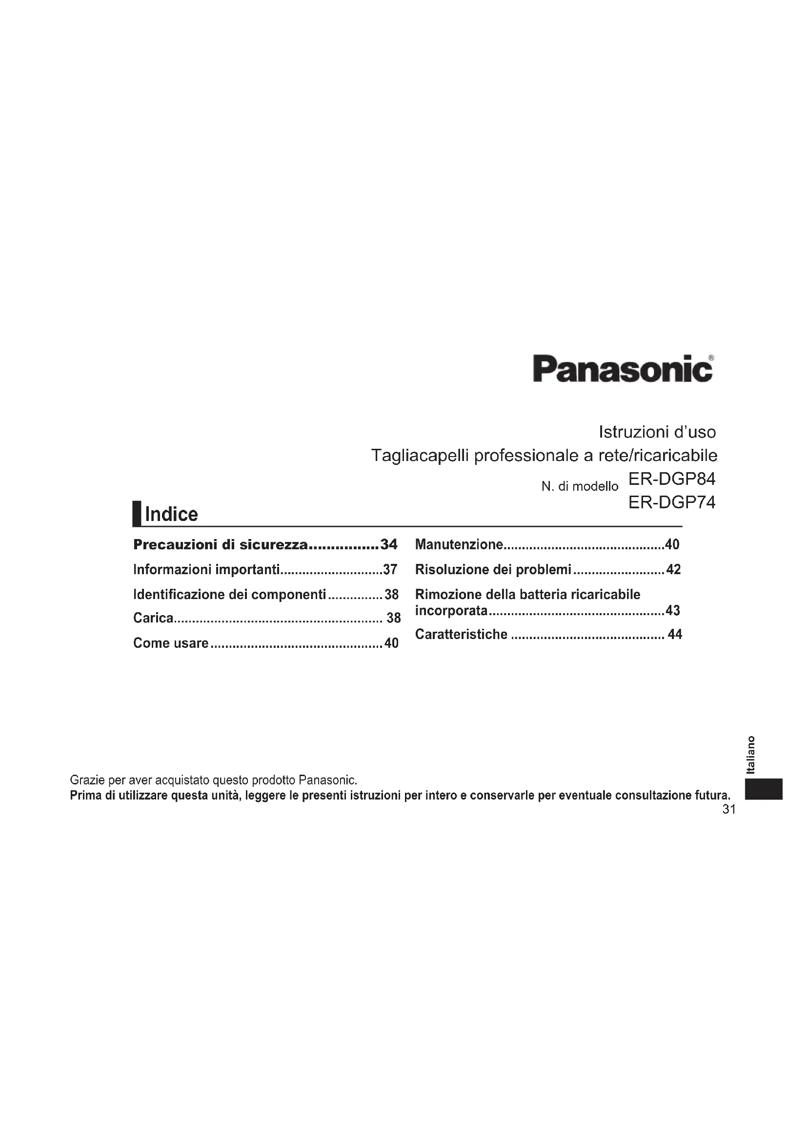Italiano Caratteristiche Sorgente di alimentazione Fare riferimento all’etichetta sull’adattatore CA. (Conversione tensione automatica) Tensione motore 3,6 V Tempo di carica 1 ora circa Potetetrovaremaggioriinformazionisull’efcienzaenergetica del prodotto sul nostro sito web, www.panasonic.com, inserendo il numero di modello nella maschera di ricerca. Smaltimento di vecchie apparecchiature e batterie usate Solo per Unione Europea e Nazioni con sistemi di raccolta e smaltimento Questi simboli sui prodotti, sull’imballaggio e/o sulle documentazioni o manuali accompagnanti i prodotti indicano che i prodotti elettrici, elettronici e le batterie usatenondevonoesseresmaltiticomeriutiurbani ma deve essere effettuata una raccolta separata. Per un trattamento adeguato , recupero e riciclaggio di vecchi prodotti e batterie usate vi invitiamo a consegnarli agli appositi punti di raccolta secondo la legislazione vigente nel vostro paese. Con uno smaltimento corretto, contribuirete a salvare importanti risorse e ad evitare i potenziali effetti negativi sulla salute umana e sull’ambiente. Per ulteriori informazioni su raccolta e riciclaggio, vi invitiamo a contattare il vostro comune. Losmaltimentononcorrettodiquestiriutipotrebbe comportare sanzioni in accordo con la legislazione nazionale. Note per il simbolo batterie (simbolo sotto) Questo simbolo può essere usato in combinazione con un simbolo chimico. In questo caso è conforme ai requisiti indicati dalla Direttiva per il prodotto chimico in questione.45 MEMO46 MEMO47