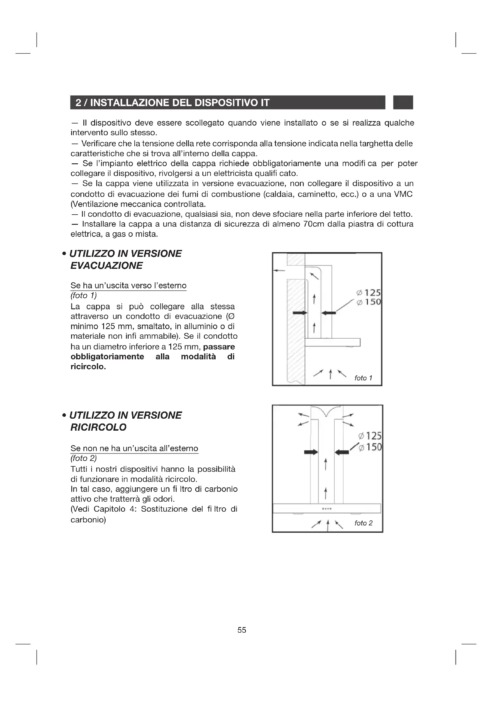 - UTILIZZO IN VERSIONE RICIRCOLO Se ha un’uscita verso l’esterno (foto 1) La cappa si può collegare alla stessa attraverso un condotto di evacuazione (Ø minimo 125 mm, smaltato, in alluminio o di materiale non in ammabile). Se il condotto ha un diametro inferiore a 125 mm, passare obbligatoriamente alla modalità di ricircolo. Se non ne ha un’uscita all’esterno (foto 2) Tutti i nostri dispositivi hanno la possibilità di funzionare in modalità ricircolo. In tal caso, aggiungere un ltro di carbonio attivo che tratterrà gli odori. (Vedi Capitolo 4: Sostituzione del ltro di carbonio) — Il dispositivo deve essere scollegato quando viene installato o se si realizza qualche intervento sullo stesso. — Veri care che la tensione della rete corrisponda alla tensione indicata nella targhetta delle caratteristiche che si trova all’interno della cappa. — Se l’impianto elettrico della cappa richiede obbligatoriamente una modi ca per poter collegare il dispositivo, rivolgersi a un elettricista quali cato. — Se la cappa viene utilizzata in versione evacuazione, non collegare il dispositivo a un condotto di evacuazione dei fumi di combustione (caldaia, caminetto, ecc.) o a una VMC (Ventilazione meccanica controllata. — Il condotto di evacuazione, qualsiasi sia, non deve sfociare nella parte inferiore del tetto. — Installare la cappa a una distanza di sicurezza di almeno 70cm dalla piastra di cottura elettrica, a gas o mista. foto 1 foto 256