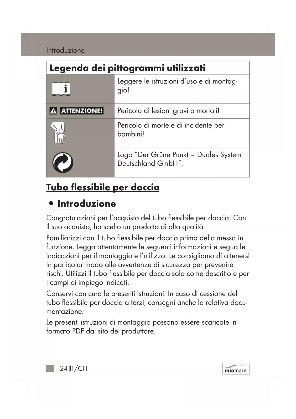 Introduzione Congratulazioni per l’acquisto del tubo flessibile per doccia! Con il suo acquisto, ha scelto un prodotto di alta qualità. Familiarizzi con il tubo flessibile per doccia prima della messa in funzione. Legga attentamente le seguenti informazioni e segua le indicazioni per il montaggio e l’utilizzo. Le consigliamo di attenersi in particolar modo alle avvertenze di sicurezza per prevenire rischi. Utilizzi il tubo flessibile per doccia solo come descritto e per i campi di impiego indicati. Conservi con cura le presenti istruzioni. In caso di cessione del tubo flessibile per doccia a terzi, consegni anche la relativa docu- mentazione. Le presenti istruzioni di montaggio possono essere scaricate in formato PDF dal sito del produttore.25IT/CH Introduzione