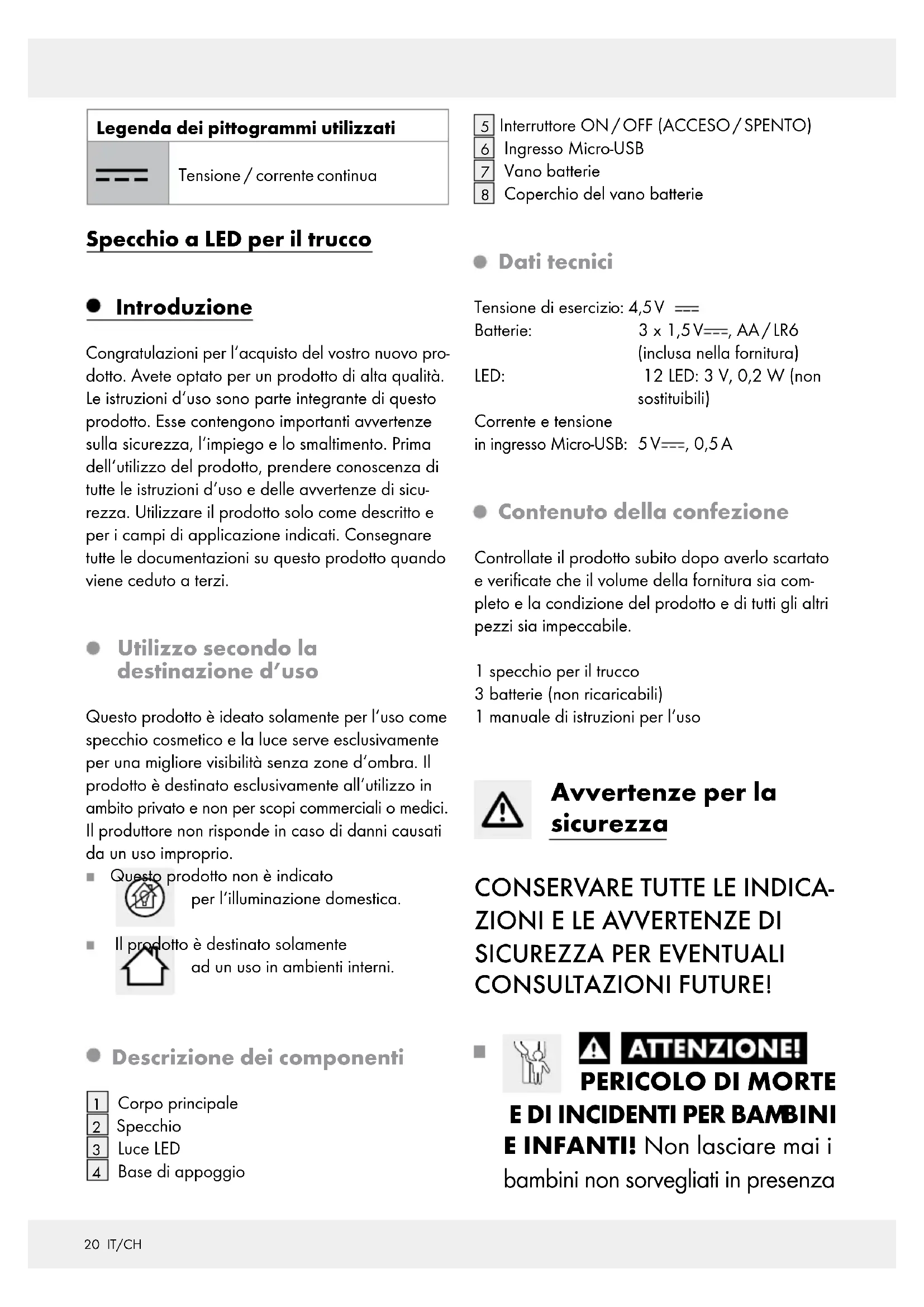 Coperchio del vano batterie Dati tecnici Tensione di esercizi o: 4,5 V Batterie: 3 x 1,5 V , AA / LR6 (inclusa nella fornitura) LED: 12 LED: 3 V, 0,2 W (non sostituibili) Corrente e tensione in ingresso Micro-USB: 5 V , 0,5 A Contenuto della confezione Controllate il prodotto subito dopo averlo scartato e verificate che il volume della fornitura sia com- pleto e la condizione del prodotto e di tutti gli altri pezzi sia impeccabile. 1 specchio per il trucco 3 batterie (non ricaricabili) 1 manuale di istruzioni per l‘uso Avvertenze per la sicurezza