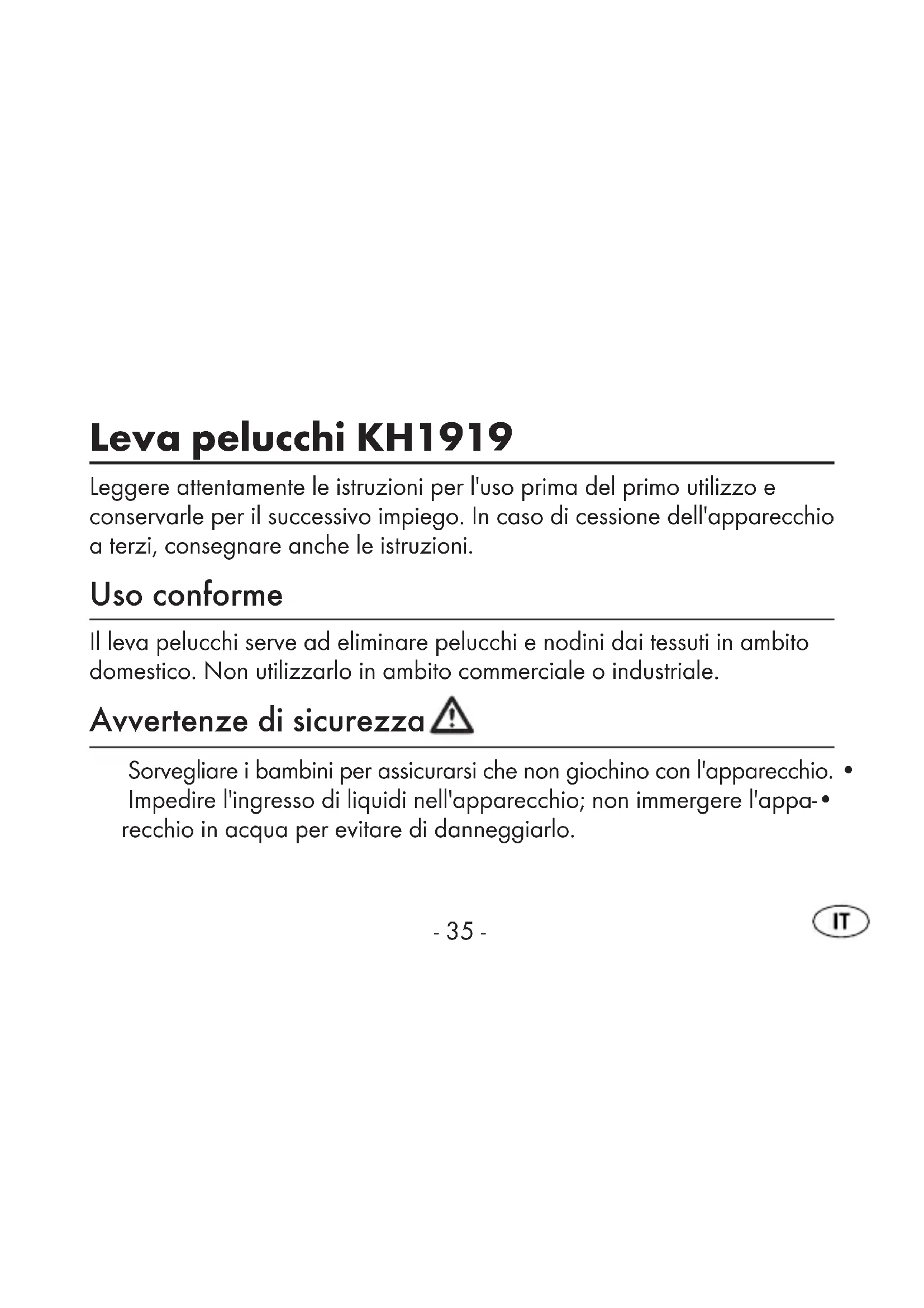 LB1.indb Abs1:34LB1.indb Abs1:34 25.02.2010 9:16:51 Uhr25.02.2010 9:16:51 Uhr- 35 - Leva pelucchi KH1919 Leggere attentamente le istruzioni per l'uso prima del primo utilizzo e conservarle per il successivo impiego. In caso di cessione dell'apparecchio a terzi, consegnare anche le istruzioni. Uso conforme Il leva pelucchi serve ad eliminare pelucchi e nodini dai tessuti in ambito domestico. Non utilizzarlo in ambito commerciale o industriale. Avvertenze di sicurezza Sorvegliare i bambini per assicurarsi che non giochino con l'apparecchio. • Impedire l'ingresso di liquidi nell'apparecchio; non immergere l'appa-• recchio in acqua per evitare di danneggiarlo. LB1.indb Abs1:35LB1.indb Abs1:35 25.02.2010 9:16:51 Uhr25.02.2010 9:16:51 Uhr- 36 - Questo apparecchio non è indicato per l'uso da parte di persone • (inclusi bambini) con limitate capacità fi siche, sensoriali o mentali o prive dell'esperienza e/o della conoscenza necessaria, a meno che tali persone non vengano sorvegliate da un responsabile per la sicu- rezza o abbiano ricevuto indicazioni sull'impiego dell'apparecchio. Evitare la penetrazione di corpi estranei. • Non aprire mai l'alloggiamento, fatta eccezione per il vano pile l'appa-• recchio non contiene componenti da sottoporre a manutenzione. In caso di malfunzionamenti o danni visibili, rivolgersi al Servizio • Assistenza Clienti. Rimuovere le pile in caso di inutilizzo prolungato dell'apparecchio, esse • infatti si scaricano e potrebbero deteriorarsi. In presenza di fuoriuscita di acidi dalle pile: indossare guanti di prote-• zione e pulire il vano pile con un panno asciutto. Utilizzare sempre esclusivamente pile nuove del tipo indicato alla voce • Dati tecnici. LB1.indb Abs1:36LB1.indb Abs1:36 25.02.2010 9:16:51 Uhr25.02.2010 9:16:51 Uhr- 37 - Non gettare le pile nel fuoco. Non cortocircuitare le pile. Non tentare • di ricaricare le pile. Sussiste il pericolo di esplosione! Tenere le pile fuori dalla portata dei bambini. I bambini potrebbero • metterle in bocca e ingoiarle. In caso di ingestione di una pila, consul- tare immediatamente un medico. Sussiste pericolo di morte! Volume di fornitura Prima della messa in funzione, controllare l'integrità della fornitura e l'even- tuale presenza di danni. Leva pelucchi KH1919 Spazzola per la pulizia, tappo protettivo, distanziatore Pile Istruzioni per l'uso LB1.indb Abs1:37LB1.indb Abs1:37 25.02.2010 9:16:51 Uhr25.02.2010 9:16:51 Uhr- 38 - Dati tecnici Tensione di alimentazione: 2 x 1,5 V tipo AA LR6 mignon Tensione: 3V DC Descrizione dell'apparecchio 1 Coperchietto del vano pile 2 Interruttore ON/OFF/livello velocità 3 Distanziatore regolabile 4 Superfi cie di taglio 5 Serbatoio Inserimento delle pile