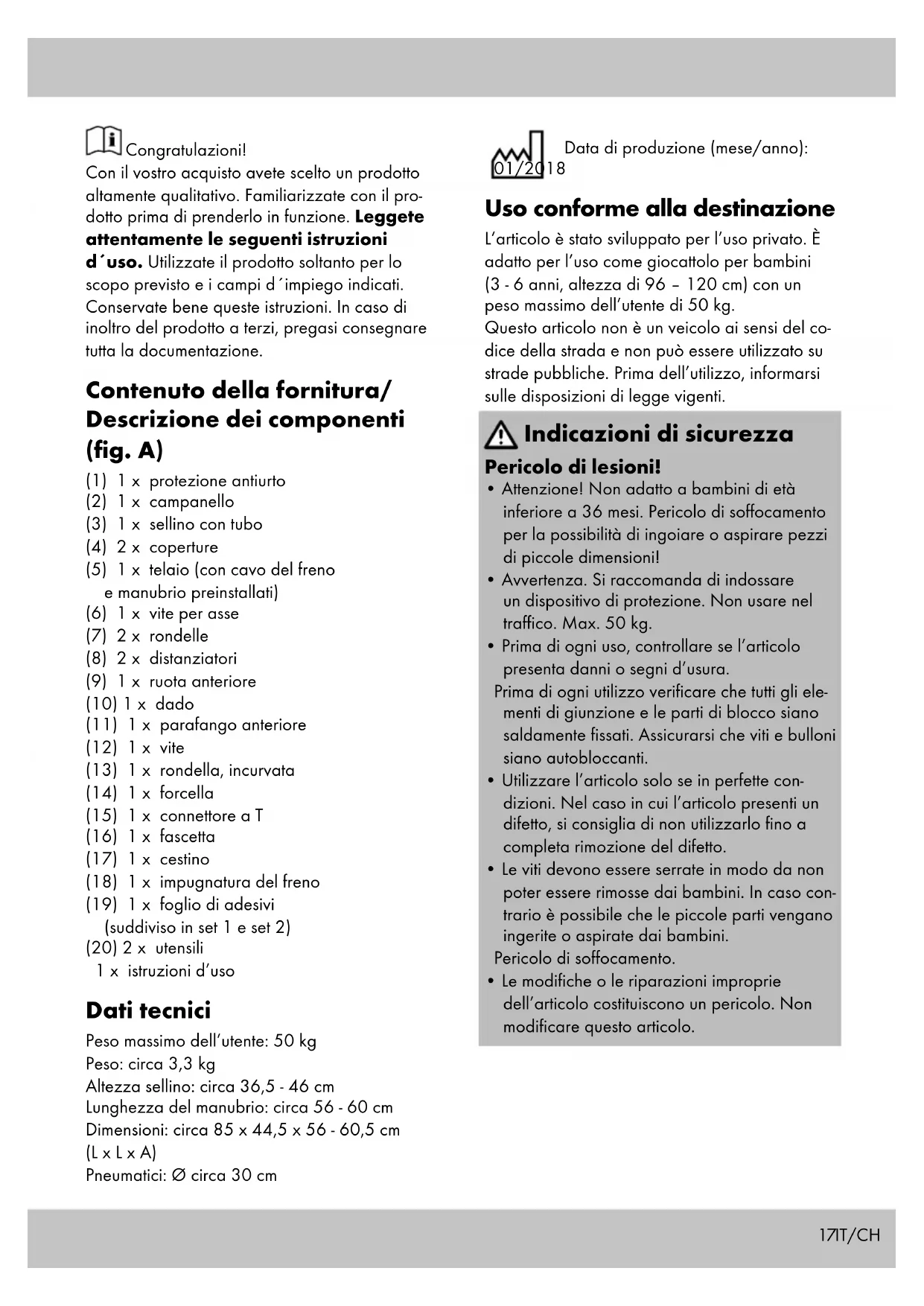 Applicare il set 1 o il set 2 di adesivi (19) nelle posizioni previste (fig. N). Impostazioni Altezza manubrio Fare attenzione all’altezza massima di estrazione. Spingere la copertura verso l’alto. Allentare la fascetta fino a quando il manubrio può essere spostato e posizionarlo all’altezza desiderata. Stringere nuovamente la fascetta e spingere infine la copertura sulla fascetta (fig. O).20 IT/CH Smaltimento Smaltire l‘articolo e i materiali dell‘imballaggio in conformità con le direttive locali in vigore. I materiali di imballaggio, come ad esempio le pellicole, non devono essere alla portata dei bambini. Conservare i materiali di imballaggio in un luogo non raggiungibile per i bambini. Avvertenze sulla garanzia e sulla gestione dei servizi di assistenza Questo prodotto è stato fabbricato con grande attenzione e sottoposto a costanti controlli. La garanzia è di tre anni dalla data d’acquisto. Conservi lo scontrino fiscale. La garanzia vale solo su difetti di materiale o di fabbricazione e decade in caso di uso errato o non conforme. Questa garanzia non costituisce una limitazione ai Suoi diritti legali e in particolare al diritto di garanzia. Per eventuali reclami vi preghiamo di contattare il seguente servizio hotline o mettervi in comunicazione con noi via e-mail. I nostri addetti all‘assistenza concorderanno con voi come procedere nel modo più rapido possibile. In qualsiasi caso vi consiglieremo per le vostre esigenze specifiche. Il periodo di garanzia non viene prolungato a seguito di riparazioni effet- tuate in garanzia, secondo il diritto di garanzia o per correntezza commerciale. Lo stesso vale anche per le parti sostituite o riparate. Le ripara- zioni dopo la scadenza della garanzia verranno effettuate a pagamento. IAN: 293617 Assistenza Svizzera Tel.: 0842 665566 (0,08 CHF/Min., telefonia mobile max. 0,40 CHF/Min.) E-Mail: deltasport@lidl.ch21GB Congratulations! With your purchase you have decided on a high-quality product. Get to know the product before you start to use it. Carefully read the following instructions for use. Use the product only as described and only for the given areas of application. Keep these instructions safe. When passing the product on to a third party, always make sure that the documentation is included. Package contents/Names of parts (Fig. A) (1) 1 x impact protection (2) 1 x bell (3) 1 x saddle with saddle tube (4) 2 x cap (5) 1 x frame (with preassembled brake cable and handlebar) (6) 1 x axle bolt (7) 2 x washer (8) 2 x spacer (9) 1 x front wheel (10) 1 x nut (11) 1 x front mudguard (12) 1 x bolt (13) 1 x washer, curved (14) 1 x fork (15) 1 x T-connector (16) 1 x clamp (17) 1 x basket (18) 1 x brake lever (19) 1 x sticker set (divided into set 1 and set 2) (20) 2 x tools 1 x instructions for use Technical data Maximum user weight: 50kg Weight: approx. 3.3kg Saddle height: approx. 36.5 - 46cm Handlebar height: approx. 56 - 60cm Dimensions: approx. 85 x 44.5 x 56 - 60.5cm (L x W x H) Tyres: Ø approx. 30cm Date of manufacture (month/year): 01/2018 Intended use This item has been developed for private use. It is suitable for use as a toy by one child (3 - 6 years, height: 96 - 120cm) with a maximum user weight of 50kg. This item is not a vehicle in terms of the Road Traffic Act and may not participate in public road traffic. Inform yourself about the statutory regulations before using the item. Safety information Risk of injury!