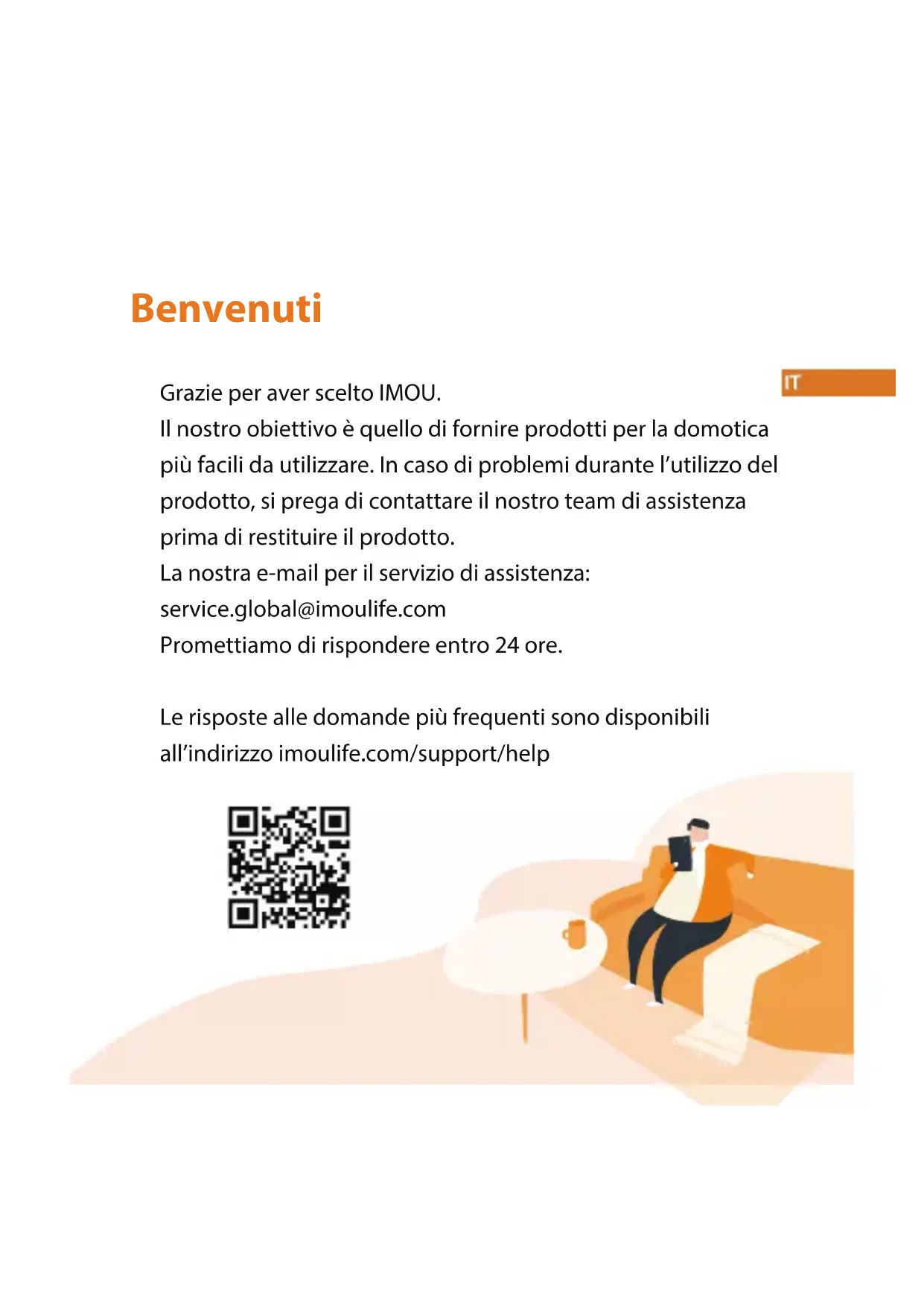 12V1AGuida Rapida www.imoulife.com BulletBenvenuti Grazie per aver scelto IMOU. Il nostro obiettivo è quello di fornire prodotti per la domotica più facili da utilizzare. In caso di problemi durante l’utilizzo del prodotto, si prega di contattare il nostro team di assistenza prima di restituire il prodotto. La nostra e-mail per il servizio di assistenza: service.global@imoulife.com Promettiamo di rispondere entro 24 ore. Le risposte alle domande più frequenti sono disponibili all’indirizzo imoulife.com/support/helpContenuto della confezione Introduzione alla telecamera Confezione di viti × 1 Telecamera × 1 Guida introduttiva ×1 Dima di posizionamento × 1 Connettore impermeabile ×1 Adattatore × 1 Riettore Antenna Wi-Fi Rilevatore PIR Microfono integrato Indicatore LED ObiettivoLED Indicator Status Device Status Nota: Tenere premuto per 10 secondi il pulsante Reimposta/Associa per reimpostare la telecamera. Slot per scheda micro-SD Tasto di ripristino Altoparlante integrato Gli indicatori LED sono descritti nella tabella seguente. Stato LED Luce verde accesa La luce verde e quella rossa lampeggiano in alternanza SPENTO Luce rossa accesa Stato dispositivo Luce verde lampeggiante Connessione di rete non riuscita Luce rossa lampeggiante Spento/LED spento Riavvio dopo il ripristino Avvio Malfunzionamento del dispositivo In attesa di rete Aggiornamento del rmware Funzionamento normale1 Windows Imou Life Tips