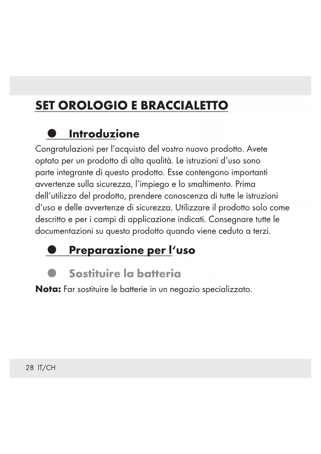 Introduzione Congratulazioni per l’acquisto del vostro nuovo prodotto. Avete optato per un prodotto di alta qualità. Le istruzioni d‘uso sono parte integrante di questo prodotto. Esse contengono importanti avvertenze sulla sicurezza, l‘impiego e lo smaltimento. Prima dell‘utilizzo del prodotto, prendere conoscenza di tutte le istruzioni d‘uso e delle avvertenze di sicurezza. Utilizzare il prodotto solo come descritto e per i campi di applicazione indicati. Consegnare tutte le documentazioni su questo prodotto quando viene ceduto a terzi. Preparazione per l‘uso Sostituire la batteria Nota: Far sostituire le batterie in un negozio specializzato.29 IT/CH Visualizzazione