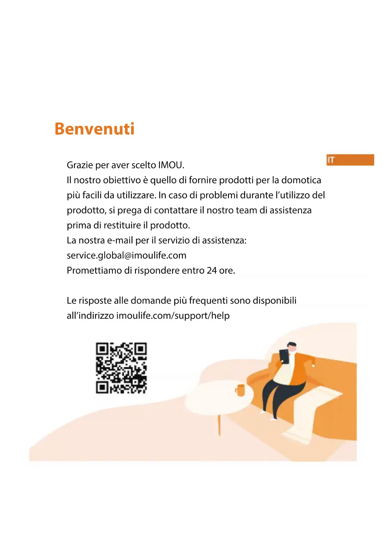 - Ne tenez pas le code QR trop près de la caméraLOOC Guida Rapida www.imoulife.comBenvenuti Grazie per aver scelto IMOU. Il nostro obiettivo è quello di fornire prodotti per la domotica più facili da utilizzare. In caso di problemi durante l’utilizzo del prodotto, si prega di contattare il nostro team di assistenza prima di restituire il prodotto. La nostra e-mail per il servizio di assistenza: service.global@imoulife.com Promettiamo di rispondere entro 24 ore. Le risposte alle domande più frequenti sono disponibili all’indirizzo imoulife.com/support/helpContenuto della confezione Introduzione alla telecamera Telecamera×1 Adattatore×1Guida introduttiva×1 Kit di viti×1 Microfono integrato Indicatore LED Obiettivo Dima di posizionamento ×1 Staffa ×1 Confezione di fascette fermacavi×1 Palanchino ×1 Rilevatore PIR RiettoreAltoparlante integratoSlot per scheda micro-SDPorta di alimentazione Nota: Gli indicatori LED sono descritti nella tabella seguente. Stato dispositivo Avvio Malfunzionamento del dispositivo In attesa di rete La luce verde e quella rossa lampeggiano in alternanza Luce verde accesa Luce rossa accesa Luce verde lampeggiante Luce rossa lampeggiante Aggiornamento del firmware Connessione di rete non riuscita Funzionamento normale Stato dell’indicatore a LED La copertura superiore può essere aperta utilizzando la barra di leva contenuta nel kit di accessori. Tenere premuto per 10 secondi il pulsante Reimposta/Associa per reimpostare la telecamera. Disattivo Spento/LED spento Riavvio dopo il ripristinoSuggerimenti Per garantire le migliori prestazioni wireless possibili, assicurarsi che non ci siano ostacoli e interferenze elettromagnetiche tra la telecamera e il router.