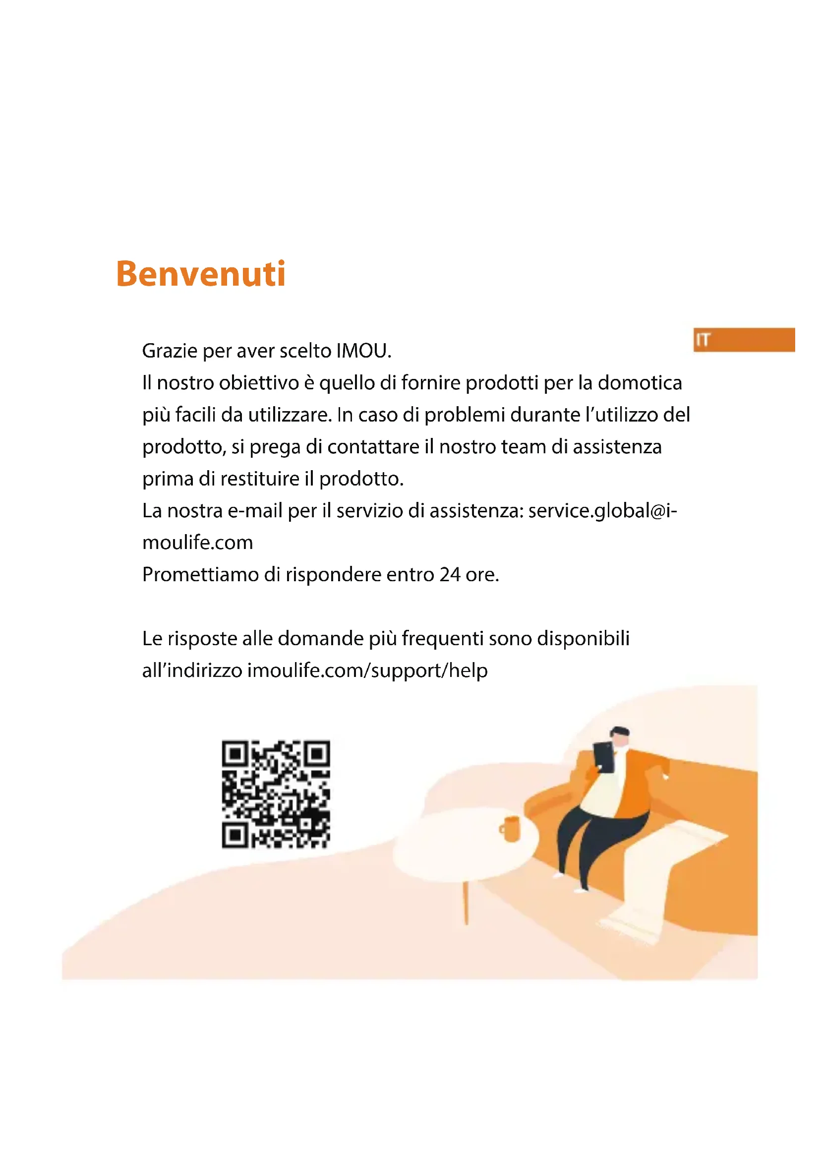 - Ne tenez pas le code QR trop près de la caméraGuida Rapida Ranger Pro www.imoulife.comBenvenuti Grazie per aver scelto IMOU. Il nostro obiettivo è quello di fornire prodotti per la domotica più facili da utilizzare. In caso di problemi durante l’utilizzo del prodotto, si prega di contattare il nostro team di assistenza prima di restituire il prodotto. La nostra e-mail per il servizio di assistenza: service.global@i- moulife.com Promettiamo di rispondere entro 24 ore. Le risposte alle domande più frequenti sono disponibili all’indirizzo imoulife.com/support/helpGuida introduttiva×1 Kit di viti×1 Telecamera×1 Cavo di alimentazione×1 Adattatore×1 Dima di posizionamento×1 Piastra di montaggio×1 Contenuto della confezione Introduzione alla telecamera Microfono integrato Obiettivo Indicatore LEDAltoparlante integratoSlot per scheda micro-SDPorta di alimentazionePorta EthernetPulsante Reimposta/Associa