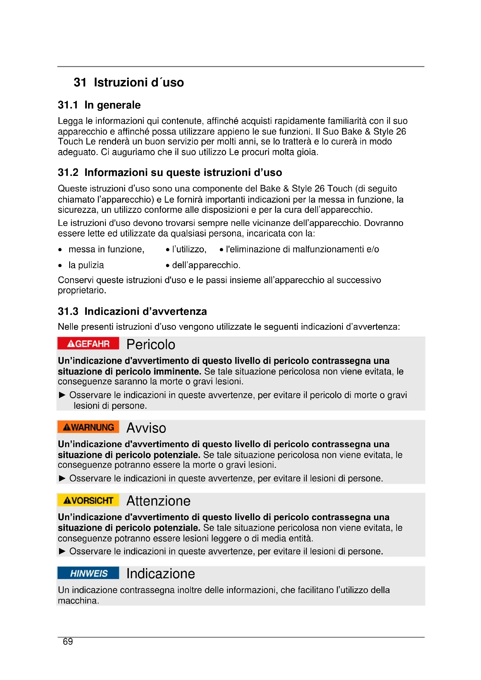 Nelle presenti istruzioni d’uso vengono utilizzate le seguenti indicazioni d’avvertenza: Pericolo Un’indicazione d'avvertimento di questo livello di pericolo contrassegna una situazione di pericolo imminente. Se tale situazione pericolosa non viene evitata, le conseguenze saranno la morte o gravi lesioni. ► Osservare le indicazioni in queste avvertenze, per evitare il pericolo di morte o gravi lesioni di persone. Avviso Un’indicazione d'avvertimento di questo livello di pericolo contrassegna una situazione di pericolo potenziale. Se tale situazione pericolosa non viene evitata, le conseguenze potranno essere la morte o gravi lesioni. ► Osservare le indicazioni in queste avvertenze, per evitare il lesioni di persone. Attenzione Un’indicazione d'avvertimento di questo livello di pericolo contrassegna una situazione di pericolo potenziale. Se tale situazione pericolosa non viene evitata, le conseguenze potranno essere lesioni leggere o di media entità. ► Osservare le indicazioni in queste avvertenze, per evitare il lesioni di persone. Indicazione Un indicazione contrassegna inoltre delle informazioni, che facilitano l’utilizzo della macchina.70