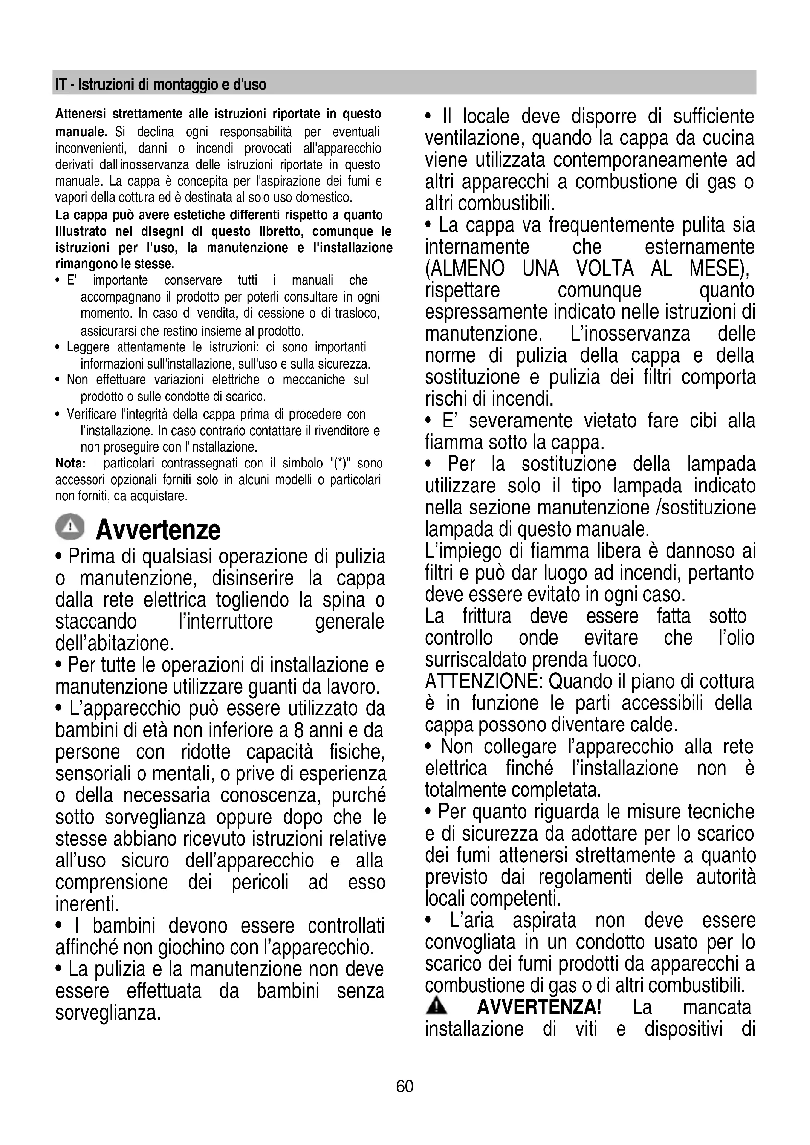 1F0360 IT - Istruzioni di montaggio e d'uso Attenersi strettamente alle istruzioni riportate in questo manuale. Si declina ogni responsabilità per eventuali inconvenienti, danni o incendi provocati all'apparecchio derivati dall'inosservanza delle istruzioni riportate in questo manuale. La cappa è concepita per l'aspirazione dei fumi e vapori della cottura ed è destinata al solo uso domestico. La cappa può avere estetiche differenti rispetto a quanto illustrato nei disegni di questo libretto, comunque le istruzioni per l'uso, la manutenzione e l'installazione rimangono le stesse.