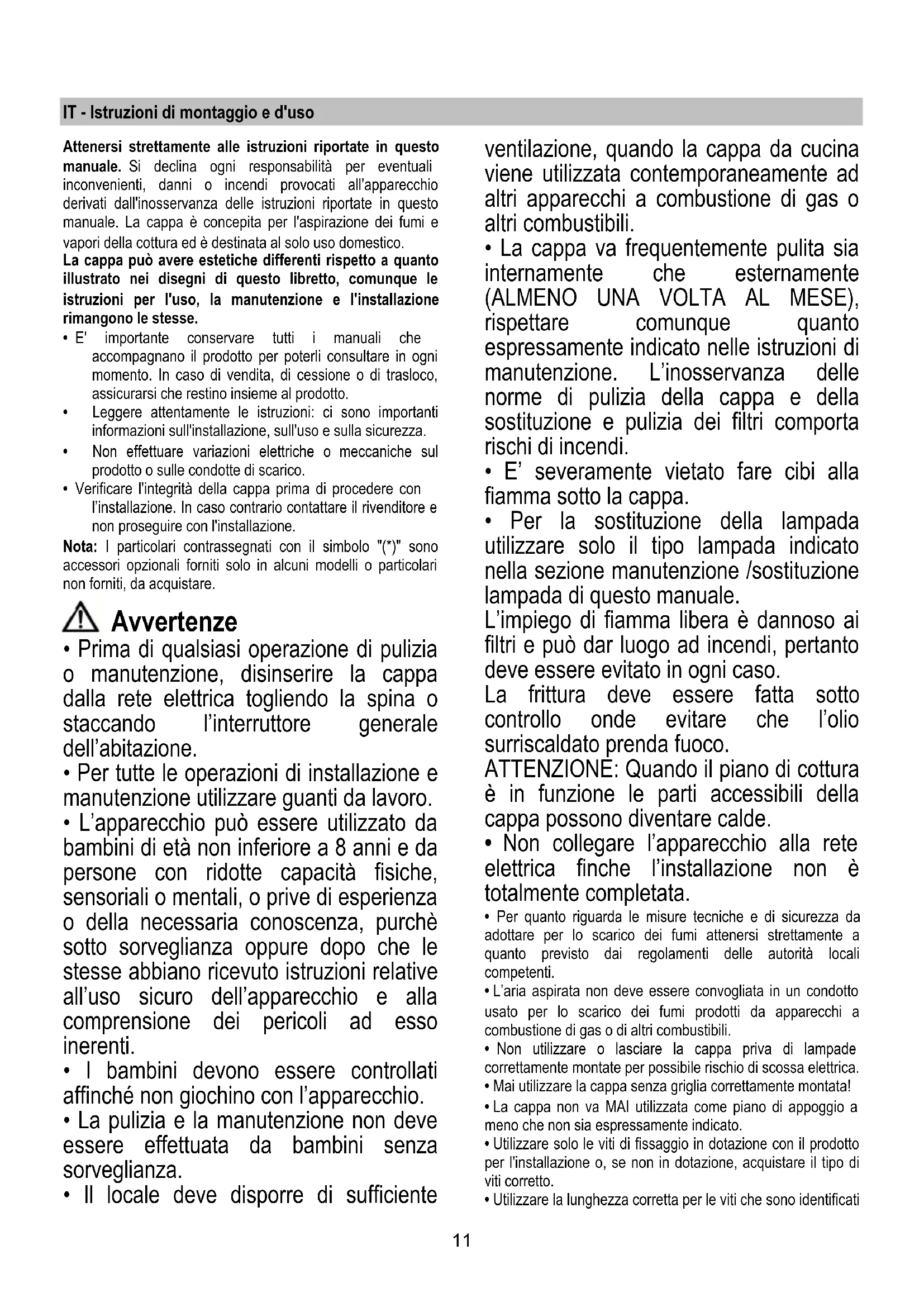 RU СМОТРИТЕ ВИДЕОРУКОВОДСТВО ПО УСТАНОВКЕ11 IT - Istruzioni di montaggio e d'uso Attenersi strettamente alle istruzioni riportate in questo manuale. Si declina ogni responsabilità per eventuali inconvenienti, danni o incendi provocati all'apparecchio derivati dall'inosservanza delle istruzioni riportate in questo manuale. La cappa è concepita per l'aspirazione dei fumi e vapori della cottura ed è destinata al solo uso domestico. La cappa può avere estetiche differenti rispetto a quanto illustrato nei disegni di questo libretto, comunque le istruzioni per l'uso, la manutenzione e l'installazione rimangono le stesse.