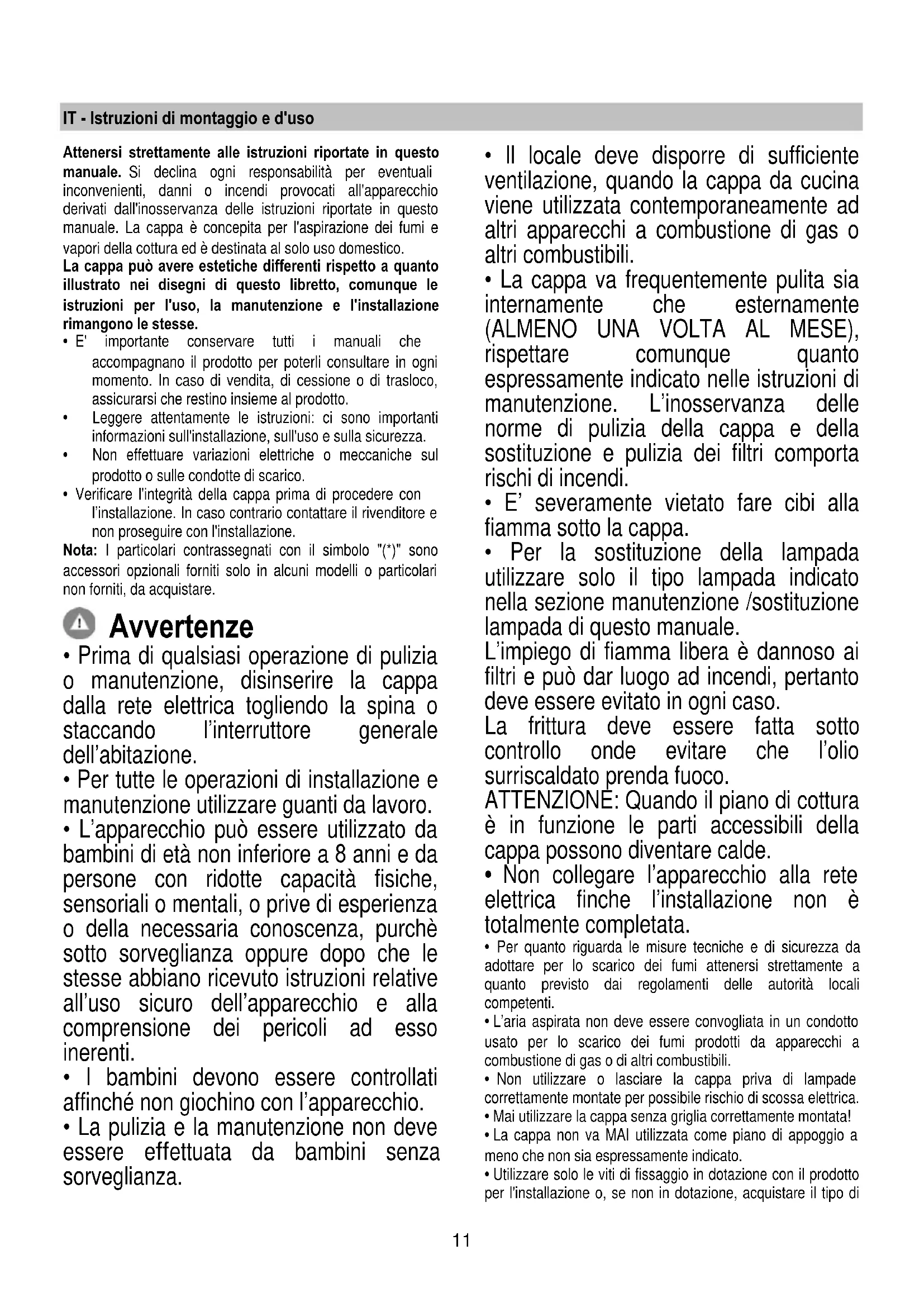 - Non utilizzare o lasciare la cappa priva di lampade correttamente montate per possibile rischio di scossa elettrica.