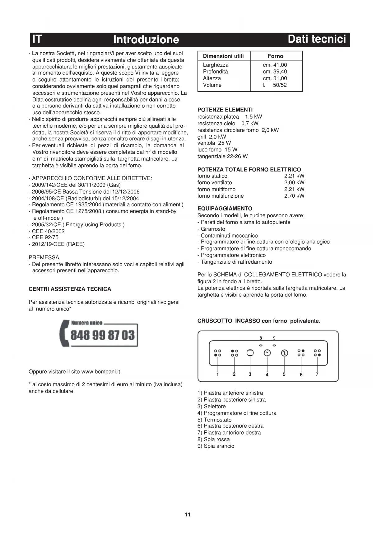 Per assistenza tecnica autorizzata e ricambi originali rivolgersi al numero unico* Oppure visitare il sito www.bompani.it