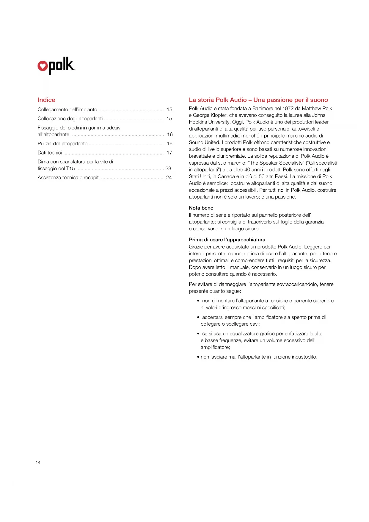 Vatios / Canal Potencia del amplificador Eficiencia 89 dB 90 dB 90 dB Entradas Bornes de 5 vías Bornes de 5 vías Bornes de 5 vías Capacidad de potencia máxima 150W 100W 150W Dimensiones Tamaño del gabinete 10.625” alto x 6.5” ancho x 7.25” diámetro 6.5” alto x 19” ancho x 8.5” diámetro 36.25” alto x 9.25” ancho x 10.25” diámetro Opciones de montaje Montaje de pared con ranura perforada integrada N/A N/A Tipo de caja Ventilada Ventilada Reflector de bajos (Bass Reflex) Unidad de envío Par Cada una Cada una Garantía del altavoz 5 años en partes y mano de obra (comprador original) 5 años en partes y mano de obra (comprador original) 5 años en partes y mano de obra (comprador original) Accesorios opcionales recomendados Soportes para altavoces de 30 - 36” N/A N/A Manual del propietario1. 14 La storia Polk Audio – Una passione per il suono Polk Audio è stata fondata a Baltimore nel 1972 da Matthew Polk e George Klopfer, che avevano conseguito la laurea alla Johns Hopkins University. Oggi, Polk Audio è uno dei produttori leader di altoparlanti di alta qualità per uso personale, autoveicoli e applicazioni multimediali nonché il principale marchio audio di Sound United. I prodotti Polk offrono caratteristiche costruttive e audio di livello superiore e sono basati su numerose innovazioni brevettate e pluripremiate. La solida reputazione di Polk Audio è espressa dal suo marchio: “The Speaker Specialists” (“Gli specialisti in altoparlanti”) e da oltre 40 anni i prodotti Polk sono offerti negli Stati Uniti, in Canada e in più di 50 altri Paesi. La missione di Polk Audio è semplice: costruire altoparlanti di alta qualità e dal suono eccezionale a prezzi accessibili. Per tutti noi in Polk Audio, costruire altoparlanti non è solo un lavoro; è una passione. Nota bene Il numero di serie è riportato sul pannello posteriore dell’ altoparlante; si consiglia di trascriverlo sul foglio della garanzia e conservarlo in un luogo sicuro. Prima di usare l’apparecchiatura Grazie per avere acquistato un prodotto Polk Audio. Leggere per intero il presente manuale prima di usare l’altoparlante, per ottenere prestazioni ottimali e comprendere tutti i requisiti per la sicurezza. Dopo avere letto il manuale, conservarlo in un luogo sicuro per poterlo consultare quando è necessario. Per evitare di danneggiare l’altoparlante sovraccaricandolo, tenere presente quanto segue: