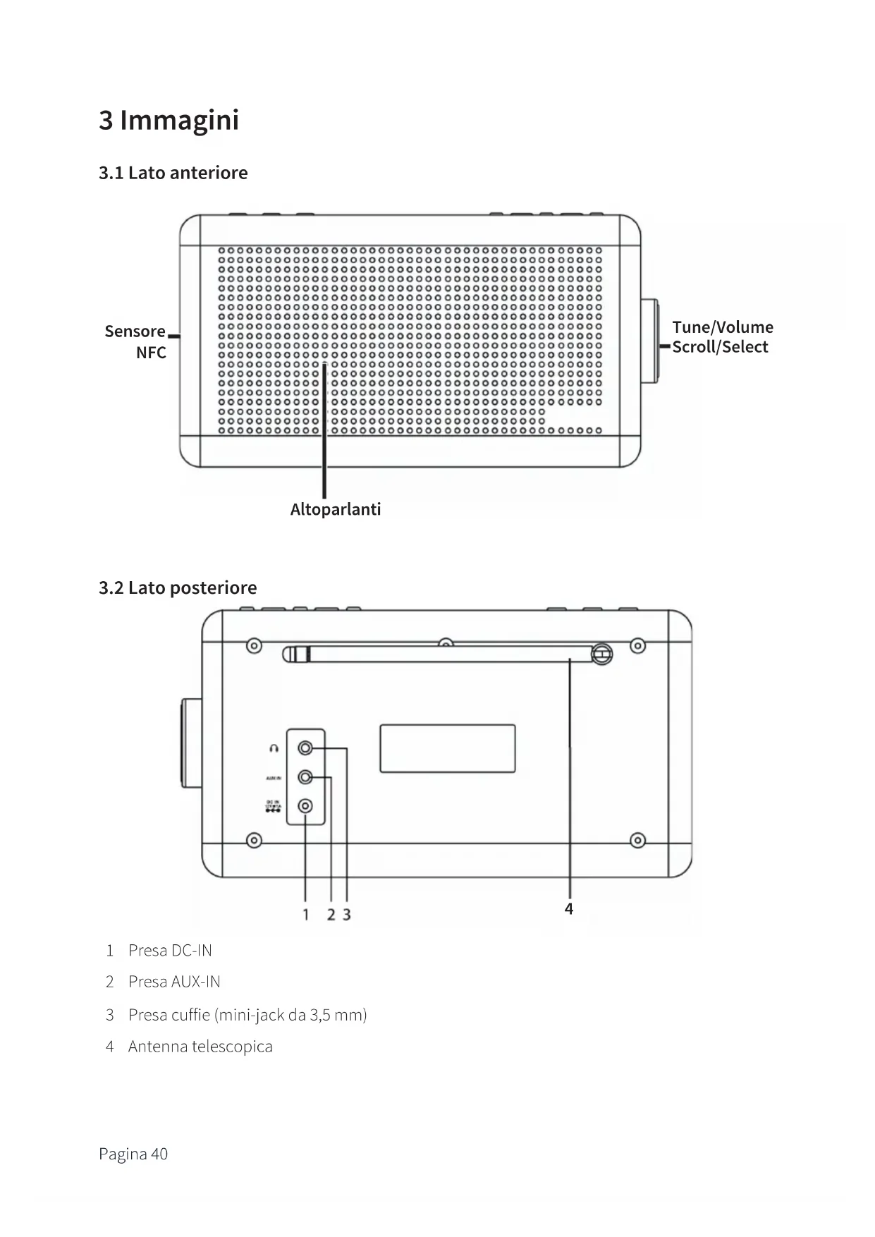 2 INFO 3 MODE - Commutazione della modalità di riproduzione 4 PAIR - Collegamento ad apparecchi Bluetooth 5 MENU - Apertura del menu 6 SHIFT 7 DISPLAY 8 TUNE 9 PRESET - Memoria dei preferiti 10 VOLUME Pagina 41Pagina 42 4 Sicurezza dell'apparecchio Leggere attentamente tutte le indicazioni di sicurezza e conservarle per eventuali consultazioni successive. Seguire sempre tutte le note e le avvertenze riportate nelle presenti istruzioni per l’uso e sul retro dell’apparecchio. Avvertenze di sicurezza Utilizzare con cautela l'adattatore di rete!