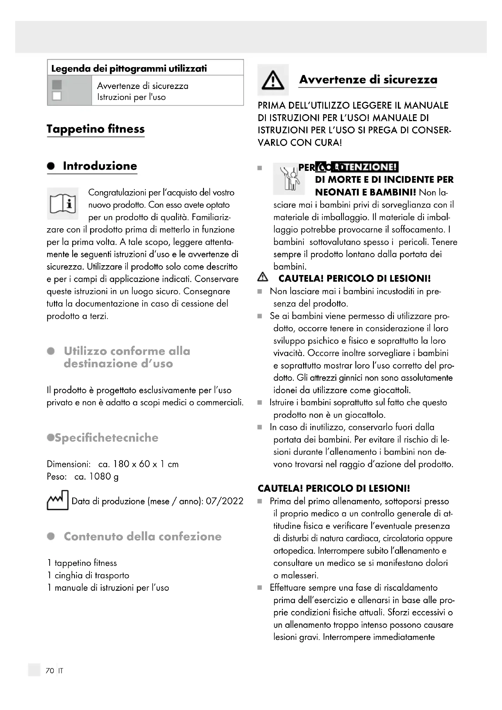 NEONATI E BAMBINI! Non la- sciare mai i bambini privi di sorveglianza con il materiale di imballaggio. Il materiale di imbal- laggio potrebbe provocarne il soffocamento. I bambini sottovalutano spesso i pericoli. Tenere sempre il prodotto lontano dalla portata dei bambini. CAUTELA! PERICOLO DI LESIONI! Non lasciare mai i bambini incustoditi in pre- senza del prodotto. Se ai bambini viene permesso di utilizzare pro- dotto, occorre tenere in considerazione il loro sviluppo psichico e fisico e soprattutto la loro vivacità. Occorre inoltre sorvegliare i bambini e soprattutto mostrar loro l’uso corretto del pro- dotto. Gli attrezzi ginnici non sono assolutamente idonei da utilizzare come giocattoli. Istruire i bambini soprattutto sul fatto che questo prodotto non è un giocattolo. In caso di inutilizzo, conservarlo fuori dalla portata dei bambini. Per evitare il rischio di le- sioni durante l’allenamento i bambini non de- vono trovarsi nel raggio d’azione del prodotto. CAUTELA! PERICOLO DI LESIONI! Prima del primo allenamento, sottoporsi presso il proprio medico a un controllo generale di at- titudine fisica e verificare l’eventuale presenza di disturbi di natura cardiaca, circolatoria oppure ortopedica. Interrompere subito l’allenamento e consultare un medico se si manifestano dolori o malesseri. Effettuare sempre una fase di riscaldamento prima dell’esercizio e allenarsi in base alle pro- prie condizioni fisiche attuali. Sforzi eccessivi o un allenamento troppo intenso possono causare lesioni gravi. Interrompere immediatamente71 IT l’esercizio in caso di fastidi, debolezza o spos- satezza e consultare un medico. Fare attenzione ai segnali del proprio corpo. Un allenamento scorretto o eccessivo può dan- neggiare la salute. Se durante l’allenamento si avverte dolore, senso di oppressione al petto, battito cardiaco irregolare, estrema mancanza di respiro, vertigini o giramenti di testa, inter- rompere immediatamente l’allenamento e con- sultare il medico. Alle donne in gravidanza si consiglia di eseguire l’allenamento soltanto previo consulto medico. Prima di utilizzare il prodotto, controllarlo per verificare l’eventuale presenza di danni e / o usura. Non utilizzare il prodotto se è danneggiato. Non utilizzare il prodotto vicino a scale o disli- velli. Non utilizzare mai il prodotto vicino a fiamme libere o forni. Il prodotto non può essere utilizzato nell’acqua, né per nuotare! Esso non mantiene a galla, né è un ausilio per nuotare. Sale e acqua clorata possono danneggiare la superficie del prodotto. Dopo l’utilizzo conservare il prodotto in un luogo asciutto. Non lasciare mai il prodotto in- custodito. Per un allenamento sicuro è necessario che ci sia abbastanza spazio. Durante l’allenamento mantenere almeno 0,6 m di distanza intorno a sé e al prodotto (Fig. G). Il prodotto è stato testato ai sensi di ISO 20957-1. È progettato esclusivamente per l’uso domestico. Durante l’allenamento indossare indumenti e calzature adeguate con suole antiscivolo. Utilizzare il prodotto esclusivamente su superfici piane e non scivolose. Pericolo derivante da usura Il prodotto può essere utilizzato solo se in per- fetto stato. Prima di ogni utilizzo controllare che il prodotto non sia danneggiato o consumato. È possibile garantire la sicurezza del prodotto solo accertandosi regolarmente dell’assenza di danni e parti usurate. Interrompere l’utilizzo in caso di danni. Proteggere il prodotto da temperature estreme, irraggiamento solare diretto e umidità. Una conservazione e un utilizzo scorretti del prodotto possono condurre a un’usura troppo veloce che può avere come conseguenza il rischio di le- sioni. Pericolo di danni materiali! Evitare il contatto del prodotto con oggetti taglienti, bollenti o pericolosi. Consigli generali per l’allenamento Prima di iniziare ogni allenamento eseguire sempre un buon riscaldamento e concludere l’allenamento in modo graduale. Non allenarsi in caso di malattia o malessere. Durante l’esecuzione degli esercizi mantenere una postura corretta del corpo. Se possibile, si consiglia di farsi mostrare ini- zialmente la corretta esecuzione degli esercizi da un fisioterapista esperto. Se si è principianti non iniziare con un carico troppo elevato. Aumentare gradatamente l’in- tensità di allenamento. Eseguire tutti gli esercizi in modo regolare e non a scatti o velocemente. Assicurarsi di respirare in modo regolare. Du- rante lo sforzo espirare e durante lo scarico inspirare. Eseguire gli esercizi al massimo finché si ha una sensazione di benessere e fino a quando si è in grado di eseguire l’esercizio correttamente. Fare pause sufficientemente lunghe tra gli eser- cizi e bere a sufficienza. Indossare un abbigliamento sportivo comodo e scarpe da ginnastica. Programma generale di allenamento Stabilire un programma di allenamento commisu- rato alle proprie esigenze, con serie di 6-8 esercizi. Tenere presente quanto segue:72 IT determinare autonomamente la frequenza e l’intensità degli esercizi. Iniziare lentamente con una frequenza di 2-3 volte a settimana e sessioni di 10 minuti e aumentare gradualmente la frequenza e l’intensità degli esercizi. Quanto più frequentemente e regolarmente si eseguono gli esercizi, tanto più ci si sentirà bene e in forma. Una serie di esercizi dovrebbe essere costituita da circa 15 ripetizioni di un esercizio. Una serie di esercizi può essere ripetuta 3 volte. Effettuare una pausa di circa 30 secondi tra gli esercizi. Se si desidera rinforzare i muscoli, lavorare con poche ripetizioni, ma con un carico di peso più elevato. Eseguire sempre il riscaldamento dei gruppi muscolari prima di iniziare l’allenamento. Si raccomanda inoltre di effettuare esercizi di stretching dopo ogni unità di allenamento. Riscaldamento Prima di ogni allenamento prendersi un tempo suffi- ciente per riscaldare i muscoli. I seguenti esercizi rappresentano solo una selezione. Per ulteriori esercizi fare riferi
