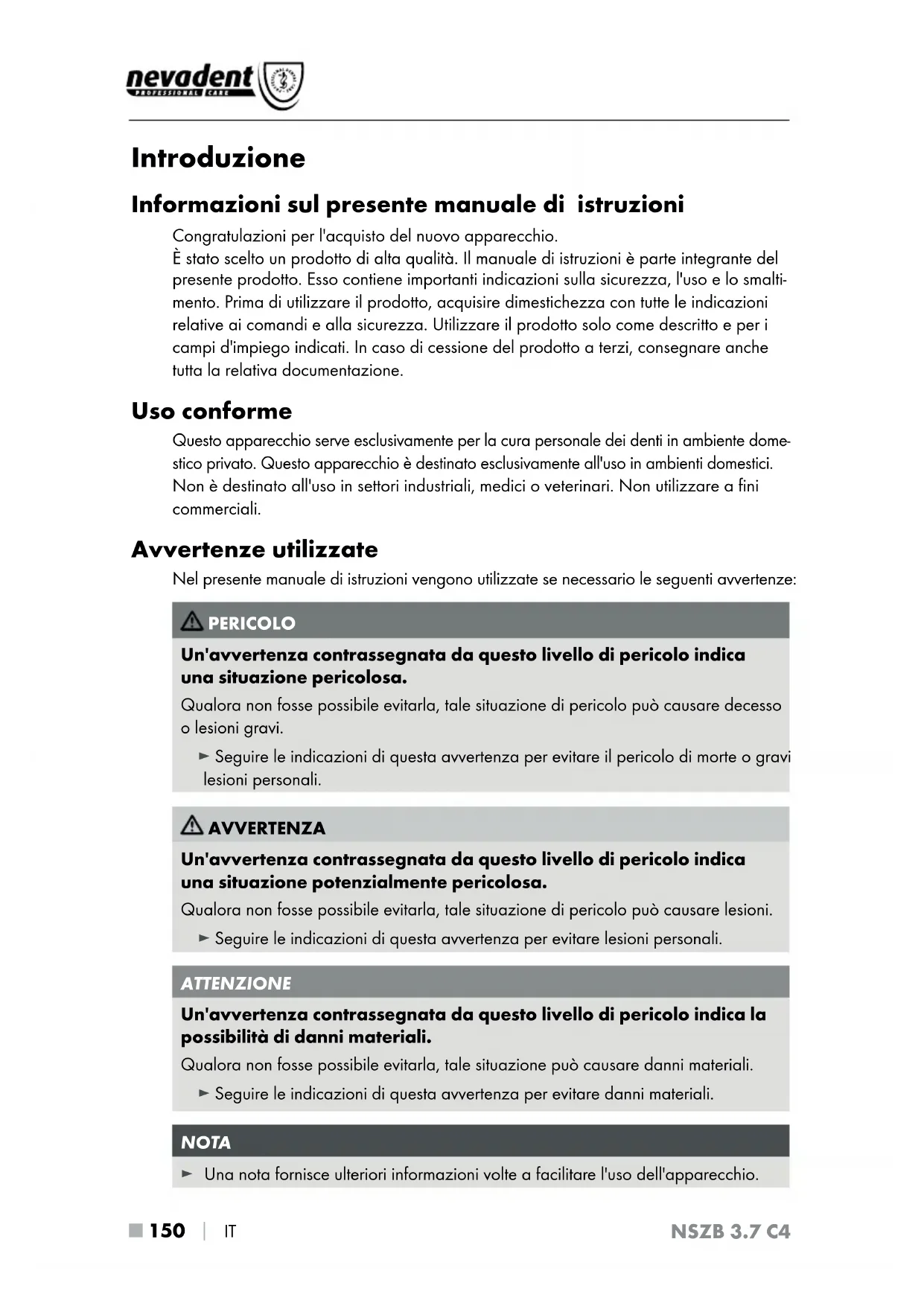 IT NSZB 3.7 C4 Introduzione Informazioni sul presente manuale di istruzioni Congratulazioni per l'acquisto del nuovo apparecchio. È stato scelto un prodotto di alta qualità. Il manuale di istruzioni è parte integrante del presente prodotto. Esso contiene importanti indicazioni sulla sicurezza, l'uso e lo smalti- mento. Prima di utilizzare il prodotto, acquisire dimestichezza con tutte le indicazioni relative ai comandi e alla sicurezza. Utilizzare il prodotto solo come descritto e per i campi d'impiego indicati. In caso di cessione del prodotto a terzi, consegnare anche tutta la relativa documentazione. Uso conforme Questo apparecchio serve esclusivamente per la cura personale dei denti in ambiente dome- stico privato. Questo apparecchio è destinato esclusivamente all'uso in ambienti domestici. Non è destinato all'uso in settori industriali, medici o veterinari. Non utilizzare a fini commerciali. Avvertenze utilizzate Nel presente manuale di istruzioni vengono utilizzate se necessario le seguenti avvertenze: PERICOLO Un'avvertenza contrassegnata da questo livello di pericolo indica una situazione pericolosa. Qualora non fosse possibile evitarla, tale situazione di pericolo può causare decesso o lesioni gravi. ► Seguire le indicazioni di questa avvertenza per evitare il pericolo di morte o gravi lesioni personali. AVVERTENZA Un'avvertenza contrassegnata da questo livello di pericolo indica una situazione potenzialmente pericolosa. Qualora non fosse possibile evitarla, tale situazione di pericolo può causare lesioni. ► Seguire le indicazioni di questa avvertenza per evitare lesioni personali. ATTENZIONE Un'avvertenza contrassegnata da questo livello di pericolo indica la possibilità di danni materiali. Qualora non fosse possibile evitarla, tale situazione può causare danni materiali. ► Seguire le indicazioni di questa avvertenza per evitare danni materiali. NOTA ► Una nota fornisce ulteriori informazioni volte a facilitare l'uso dell'apparecchio.IT