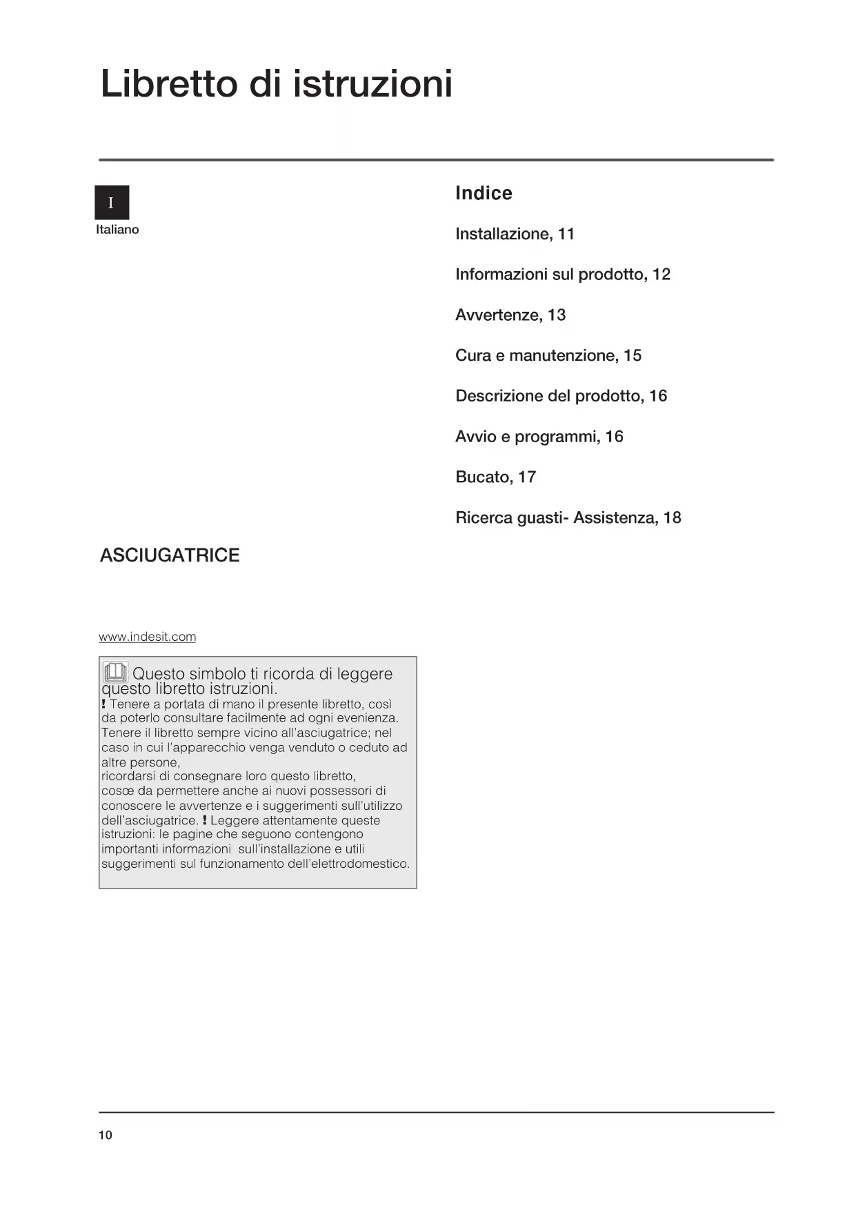 - ●The Start button has not been pressed (see Start and Programmes).10 Italiano Libretto di istruzioni Indice Installazione, 11 Informazioni sul prodotto, 12 Avvertenze, 13 Cura e manutenzione, 15 Descrizione del prodotto, 16 Avvio e programmi, 16 Bucato, 17 Ricerca guasti- Assistenza, 18 ASCIUGATRICE Questo simbolo ti ricorda di leggere questo libretto istruzioni. ! Tenere a portata di mano il presente libretto, così da poterlo consultare facilmente ad ogni evenienza. Tenere il libretto sempre vicino all’asciugatrice; nel caso in cui l’apparecchio venga venduto o ceduto ad altre persone, ricordarsi di consegnare loro questo libretto, cosœ da permettere anche ai nuovi possessori di conoscere le avvertenze e i suggerimenti sull’utilizzo dell’asciugatrice. ! Leggere attentamente queste istruzioni: le pagine che seguono contengono importanti informazioni sull’installazione e utili suggerimenti sul funzionamento dell’elettrodomestico.