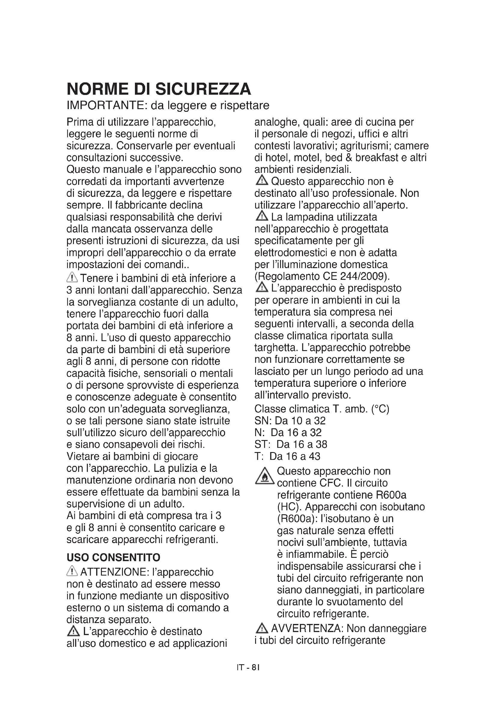 IMPORTANTE: da leggere e rispettare Prima di utilizzare l’apparecchio, leggere le seguenti norme di sicurezza. Conservarle per eventuali consultazioni successive. Questo manuale e l’apparecchio sono corredati da importanti avvertenze di sicurezza, da leggere e rispettare sempre. Il fabbricante declina qualsiasi responsabilità che derivi dalla mancata osservanza delle presenti istruzioni di sicurezza, da usi impropri dell’apparecchio o da errate impostazioni dei comandi.. Tenere i bambini di età inferiore a 3 anni lontani dall’apparecchio. Senza la sorveglianza costante di un adulto, tenere l’apparecchio fuori dalla portata dei bambini di età inferiore a 8 anni. L’uso di questo apparecchio da parte di bambini di età superiore agli 8 anni, di persone con ridotte capacità siche, sensoriali o mentali o di persone sprovviste di esperienza e conoscenze adeguate è consentito solo con un’adeguata sorveglianza, o se tali persone siano state istruite sull’utilizzo sicuro dell’apparecchio e siano consapevoli dei rischi. Vietare ai bambini di giocare con l’apparecchio. La pulizia e la manutenzione ordinaria non devono essere effettuate da bambini senza la supervisione di un adulto. Ai bambini di età compresa tra i 3 e gli 8 anni è consentito caricare e scaricare apparecchi refrigeranti. USO CONSENTITO ATTENZIONE: l’apparecchio non è destinato ad essere messo in funzione mediante un dispositivo esterno o un sistema di comando a distanza separato. L’apparecchio è destinato all’uso domestico e ad applicazioni analoghe, quali: aree di cucina per il personale di negozi, ufci e altri contesti lavorativi; agriturismi; camere di hotel, motel, bed & breakfast e altri ambienti residenziali. Questo apparecchio non è destinato all’uso professionale. Non utilizzare l’apparecchio all’aperto. La lampadina utilizzata nell’apparecchio è progettata specicatamente per gli elettrodomestici e non è adatta per l’illuminazione domestica (Regolamento CE 244/2009). L’apparecchio è predisposto per operare in ambienti in cui la temperatura sia compresa nei seguenti intervalli, a seconda della classe climatica riportata sulla targhetta. L’apparecchio potrebbe non funzionare correttamente se lasciato per un lungo periodo ad una temperatura superiore o inferiore all’intervallo previsto. Classe climatica T. amb. (°C) SN: Da 10 a 32 N: Da 16 a 32 ST: Da 16 a 38 T: Da 16 a 43 Questo apparecchio non contiene CFC. Il circuito refrigerante contiene R600a (HC). Apparecchi con isobutano (R600a): l’isobutano è un gas naturale senza effetti nocivi sull’ambiente, tuttavia è inammabile. È perciò indispensabile assicurarsi che i tubi del circuito refrigerante non siano danneggiati, in particolare durante lo svuotamento del circuito refrigerante. AVVERTENZA: Non danneggiare i tubi del circuito refrigeranteIT - 82 dell’apparecchio. AVVERTENZA: Mantenere libere da ostruzioni le aperture di ventilazione nello spazio circostante l’apparecchio o nella nicchia di incasso. AVVERTENZA: Non usare dispositivi meccanici, elettrici o chimici diversi da quelli raccomandati dal produttore per accelerare il processo di sbrinamento. AVVERTENZA: Non usare o introdurre apparecchiature elettriche all’interno degli scomparti dell’apparecchio se queste non sono del tipo espressamente autorizzato dal produttore. AVVERTENZA: i produttori di ghiaccio e/o i distributori d’acqua non direttamente collegati all’alimentazione idrica devono essere riempiti unicamente con acqua potabile. AVVERTENZA: I produttori di ghiaccio e/o distributori d’acqua devono essere collegati a un condotto di alimentazione che fornisca soltanto acqua potabile, con una pressione dell’acqua compresa tra 0,17 e 0,81 MPa (1,7 e 8,1 bar). Non conservare all’interno dell’apparecchio sostanze esplosive quali bombolette spray con propellente inammabile. Non ingerire il liquido (atossico) contenuto negli accumulatori di freddo (presenti in alcuni modelli). Non mangiare cubetti di ghiaccio o ghiaccioli subito dopo averli tolti dal congelatore poiché potrebbero causare bruciature da freddo. Per i prodotti che prevedono l’uso di un ltro aria all’interno di un coperchio ventola accessibile, il ltro deve essere sempre in posizione quando il frigorifero è in funzione. Non conservare nel comparto congelatore alimenti liquidi in contenitori di vetro, perché questi potrebbero rompersi. Non ostruire la ventola (se presente) con gli alimenti. Dopo avere introdotto gli alimenti, assicurarsi che le porte dei comparti si chiudano bene, in particolare la porta del comparto congelatore. Sostituire non appena possibile le guarnizioni danneggiate. Utilizzare il comparto frigorifero solo per la conservazione di alimenti freschi e il comparto congelatore solo per la conservazione di alimenti congelati, la congelazione di cibi freschi e la produzione di cubetti di ghiaccio. Non conservare alimenti senza confezione a contatto diretto con le superci del frigorifero o del congelatore. Gli apparecchi possono essere dotati di comparti speciali (comparto cibi freschi, comparto zero gradi, ecc.). Se non altrimenti indicato nel libretto del prodotto, questi comparti possono essere rimossi mantenendo prestazioni equivalenti. Il C-Pentano è utilizzato come agente dilatante nella schiuma isolante ed è un gas inammabile. Di seguito sono descritti i comparti dell’apparecchio più adatti per la conservazione di specici tipi di alimenti tenendo conto della diversa distribuzione delle temperature: - Comparto frigorifero: