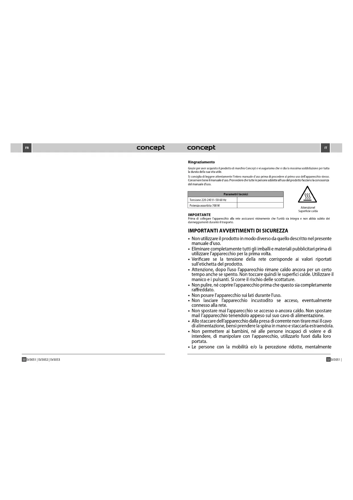 Ringraziamento Grazie per aver acquisito il prodotto di marchio Concept e vi auguriamo che vi dia la massima soddisfazione per tutta la durata della sua vita utile. Si consiglia di leggere attentamente l’intero manuale d’uso prima di procedere al primo uso dell’apparecchio stesso. Conservare bene il manuale d’uso. Provvedere che tutte le persone addette all’uso del prodotto facciano la conoscenza del manuale d’uso. Parametri tecnici Tensione 220-240 V~50-60 Hz Potenza assorbita 700 W IMPORTANTE Prima di collegare l’apparecchio alla rete assicurarsi visivamente che l’unità sia integra e non abbia subito dei danneggiamenti durante il trasporto.