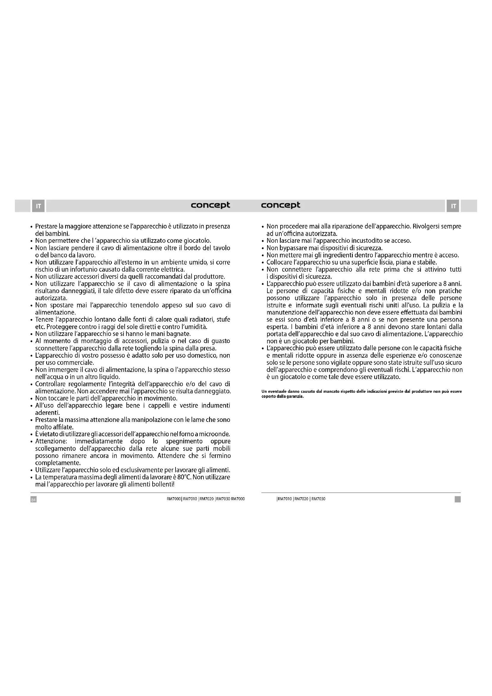 Qualora però si tratti di un difetto irreparabile eall’utente nasce il diritto alla sostituzione del prodotto o di una sua parte e la sostituzione non è praticabile, per esempio per motivi di vendita completa del rispettivo prodotto, l’utente ha diritto di restituire il prodotto (recedere dal contratto). Il diritto alla fornitura del prodotto nuovo (alla sostituzione), oppure al cambio di un elemento del prodotto ha l’utente anche nel caso di un difetto riparabile, se limitato nell’uso normale del prodotto per la presenza ripetuta del danno o per il numero maggiore dei danni. In tal caso l’utente ha diritto alla restituzione del prodotto (recesso dal contratto). Se non viene effettuata la restituzione del prodotto (recessione dal contratto) oppure se l’utente non rivendica il diritto alla fornitura del prodotto nuovo (sostituzione), alla sostituzione di un elemento del prodotto oppure alla riparazione del prodotto stesso, può richiedere uno sconto adeguato. L’utente ha diritto ad uno sconto adeguato anche qualora non gli possa essere fornito un prodotto nuovo, privo dei difetti, sostituito un elemento del prodotto oppure effettuata la riparazione del prodotto stesso, nonché qualora non possa essere posto il rimedio entro un periodo adeguato oppure il provvedimento al rimedio comporti dei grossi problemi all’utente stesso. Il venditore, il centro di assistenza autorizzato oppure un operatore incaricato da questi decidono sulla contestazione immediatamente, nei casi complicati entro tre giorni lavorativi. In quel tempo non viene calcolato il periodo necessario per una valutazione peritale del difetto. La contestazione del difetto e l’eliminazione dello stesso devono essere risolti senza rinvii, entro 30giorni dal giorno di presentazione del reclamo, salve le pattuizioni diverse fatte tra il centro di assistenza autorizzato e l’utente. Alla restituzione del prodotto (recessione dal contratto) l’utente è tenuto a restituire pure tutti gli accessori e tutti i documenti forniti insieme con il prodotto. L’utente non ha diritto a ricevere indietro i pezzi e gli elementi difettosi del prodotto sostituiti nell’ambito della riparazione. Ogni altro diritto dell’utente relativo all’acquisto del prodotto non viene meno con l’applicazione delle condizioni di garanzia. Nota: La contestazione del prodotto danneggiato durante il trasporto è regolata dall’ordinamento contestazioni del trasportatore. Produttore: Jindřich Valenta – Concept Vysokomýtská 1800, 565 01 Choceň Repubblica Ceca C.F. 13216660 tel.: + 420.465.471.400, fax: +420.465.473.304. email: servis@my-concept.cz www: www.my-concept.com Dettagli sul prodotto Modello: Numero di matricola: Data di vendita: Timbro e firma del produttore:132 133 RM7000